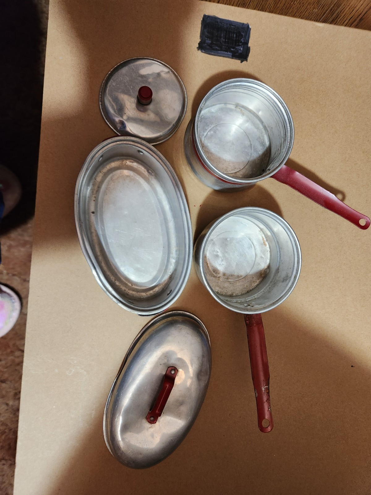 • Vintage Childs Aluminum Double Boiler Rooster Red Handle