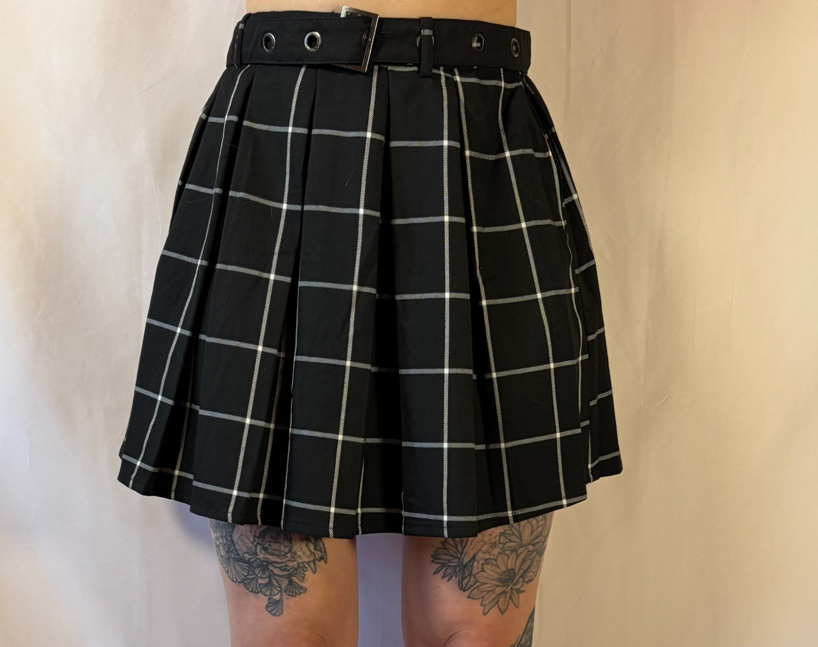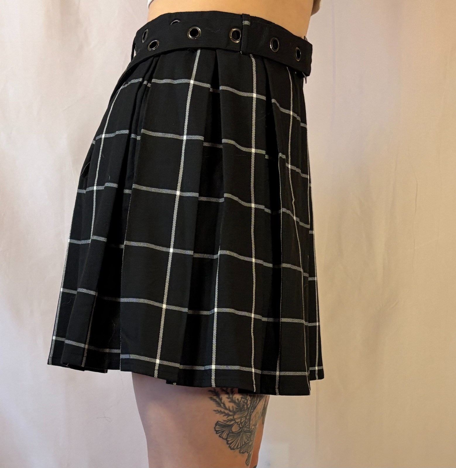 Hot Topic Black Plaid Pleated Skirt w/ Belt Women s M High Waist Grunge Punk