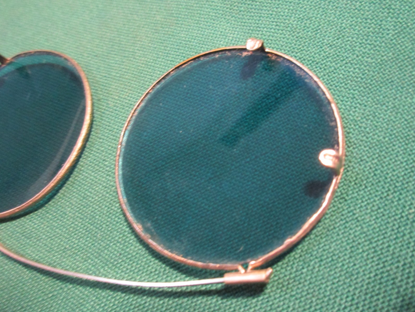 ANTIQUE 1910-20 ERA CLIP ON BLUE GLASS SUN GLASSES