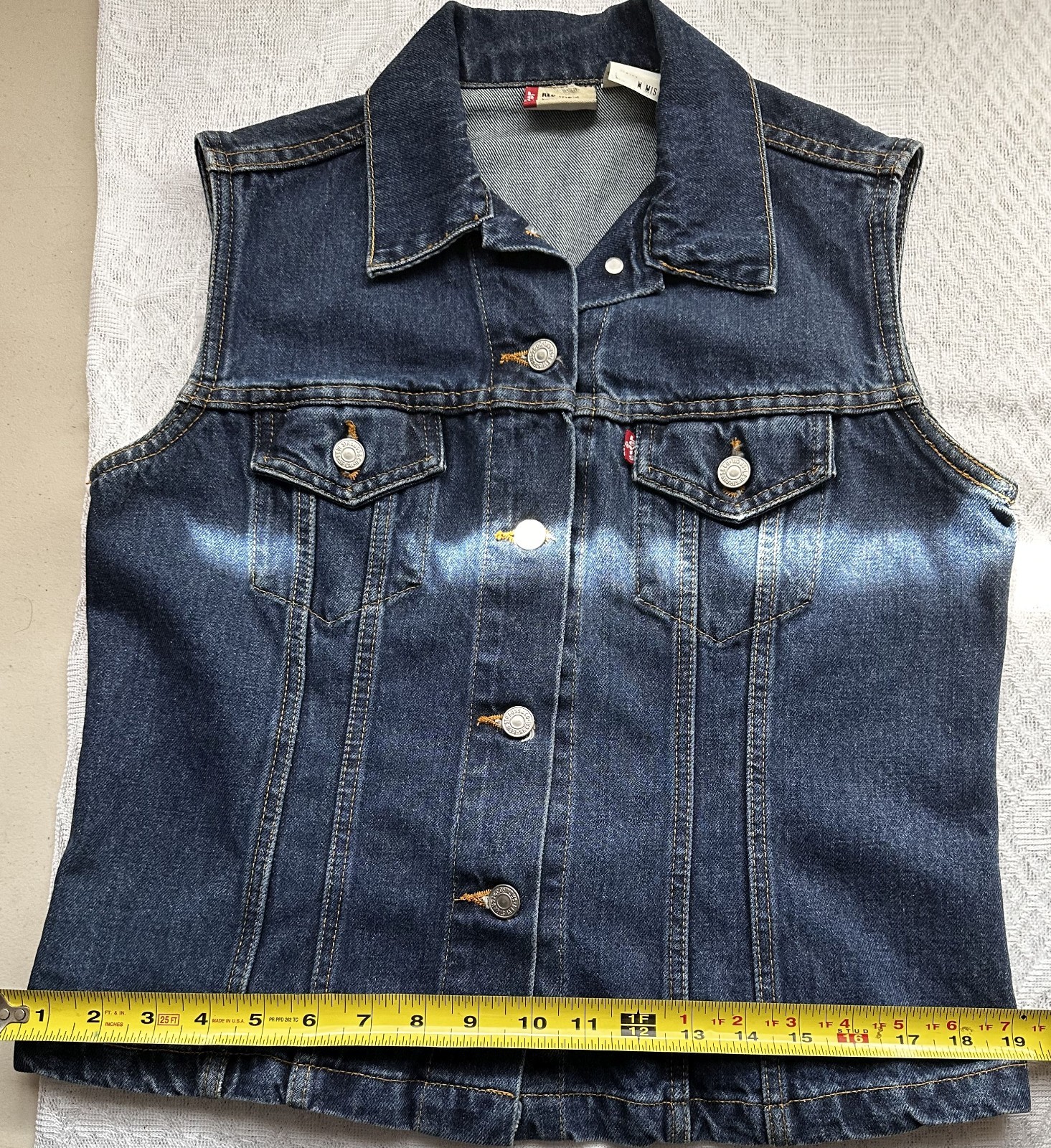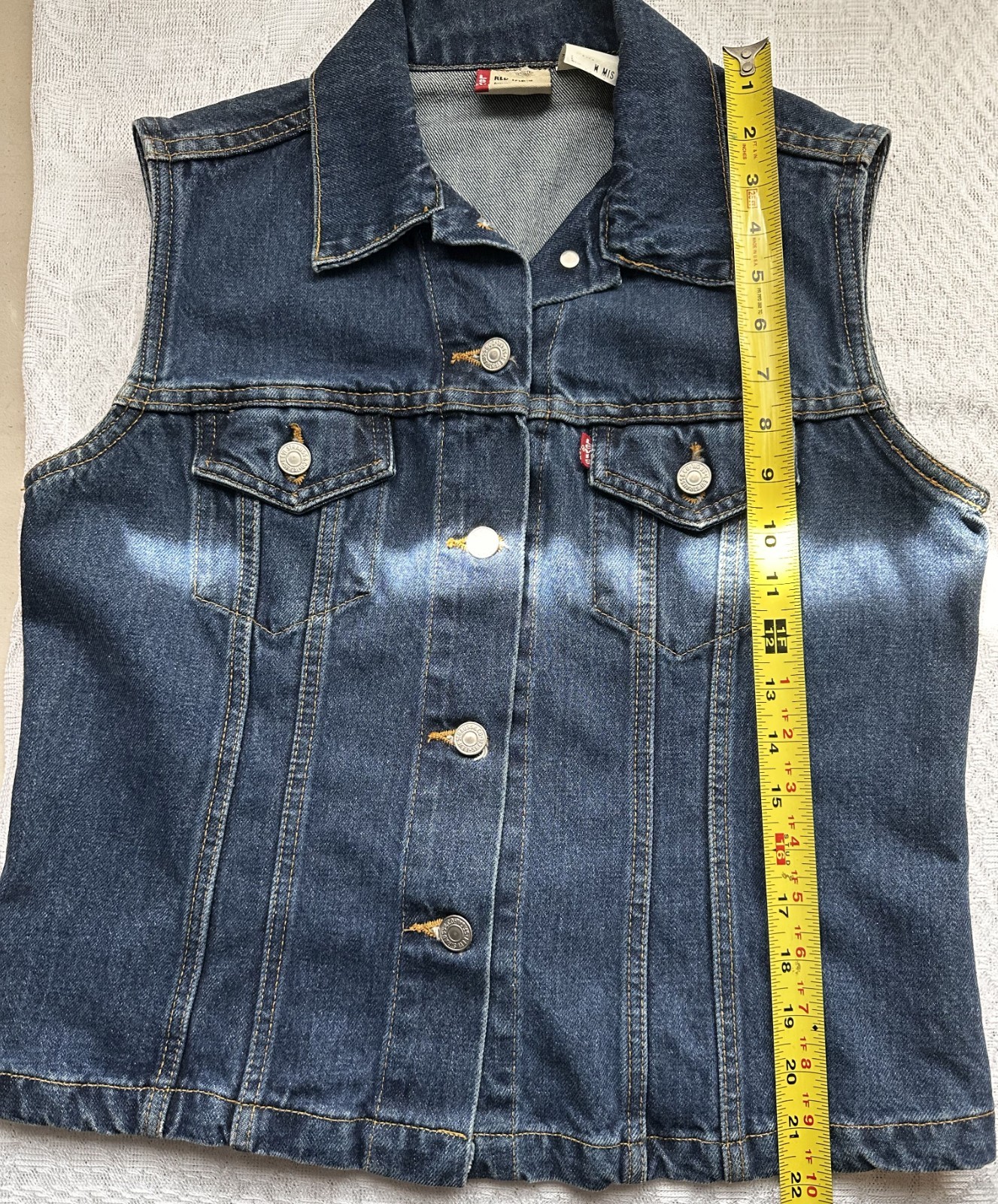 как выглядит Levis Red Tab Denim Jean Trucker Vest Womens Size M Cinch Back USA ca. 2000 фото