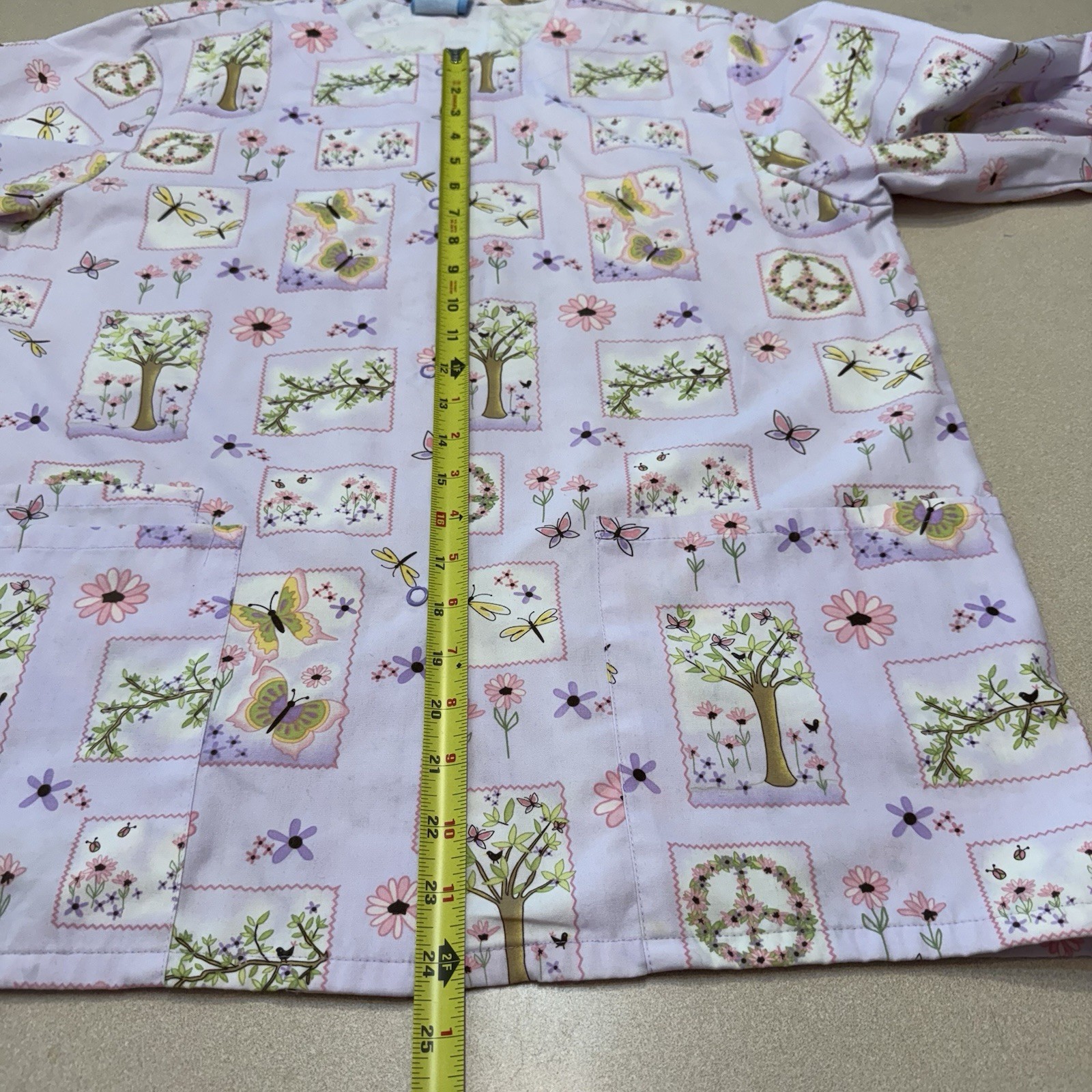 как выглядит Scrub HQ Button Up Long Sleeve Scrub Top Flower Butterfly Dragonfly Read фото