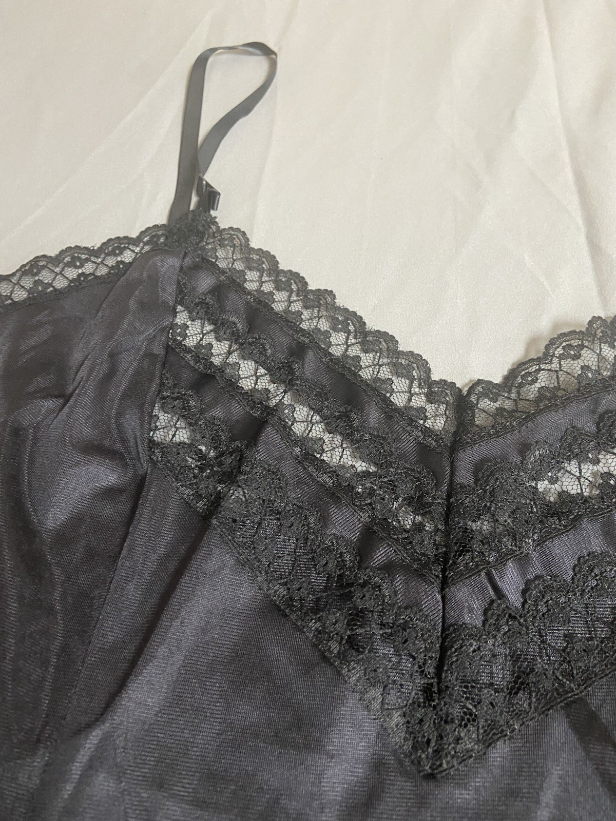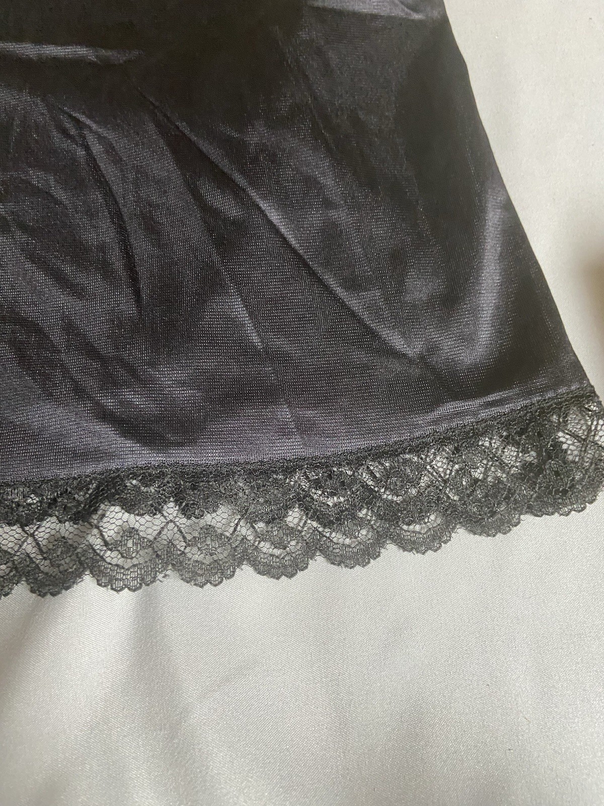 как выглядит Vintage Black Nylon Camisole w/Lace Trim Size 52 EUC Made In USA фото