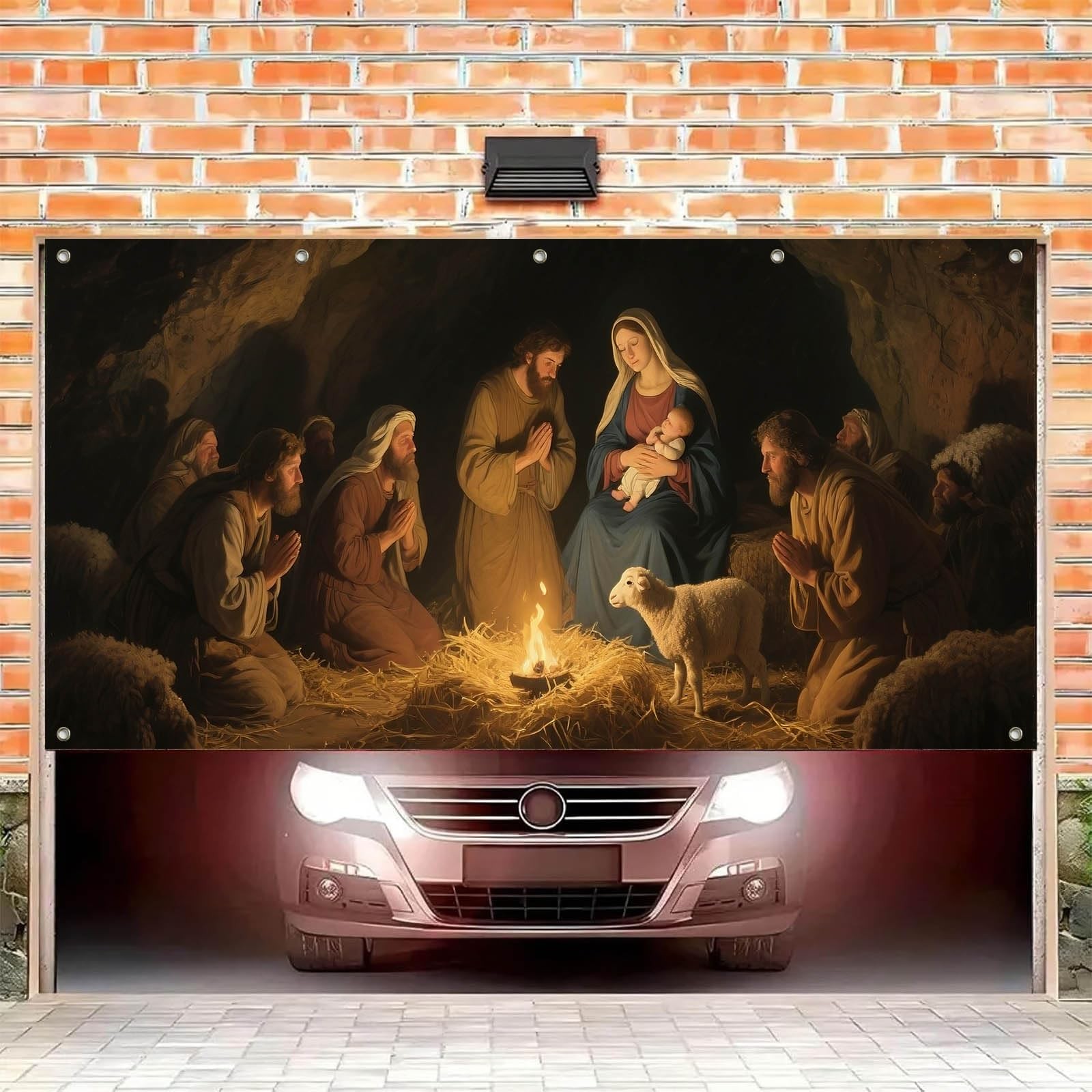 • 13x6ft Nativity Scene Garage Door Banner Shepherds Adoring Baby Jesus Mary Po...