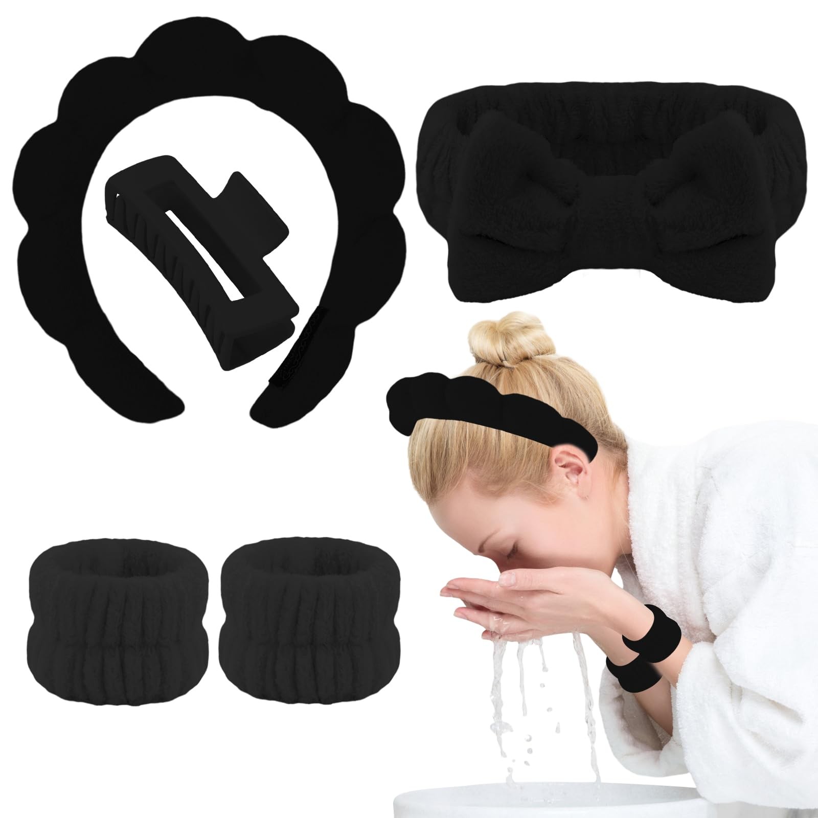 как выглядит Terry Cloth Spa Headband Wristbands Set with Hair Clips for Face Wash Black фото
