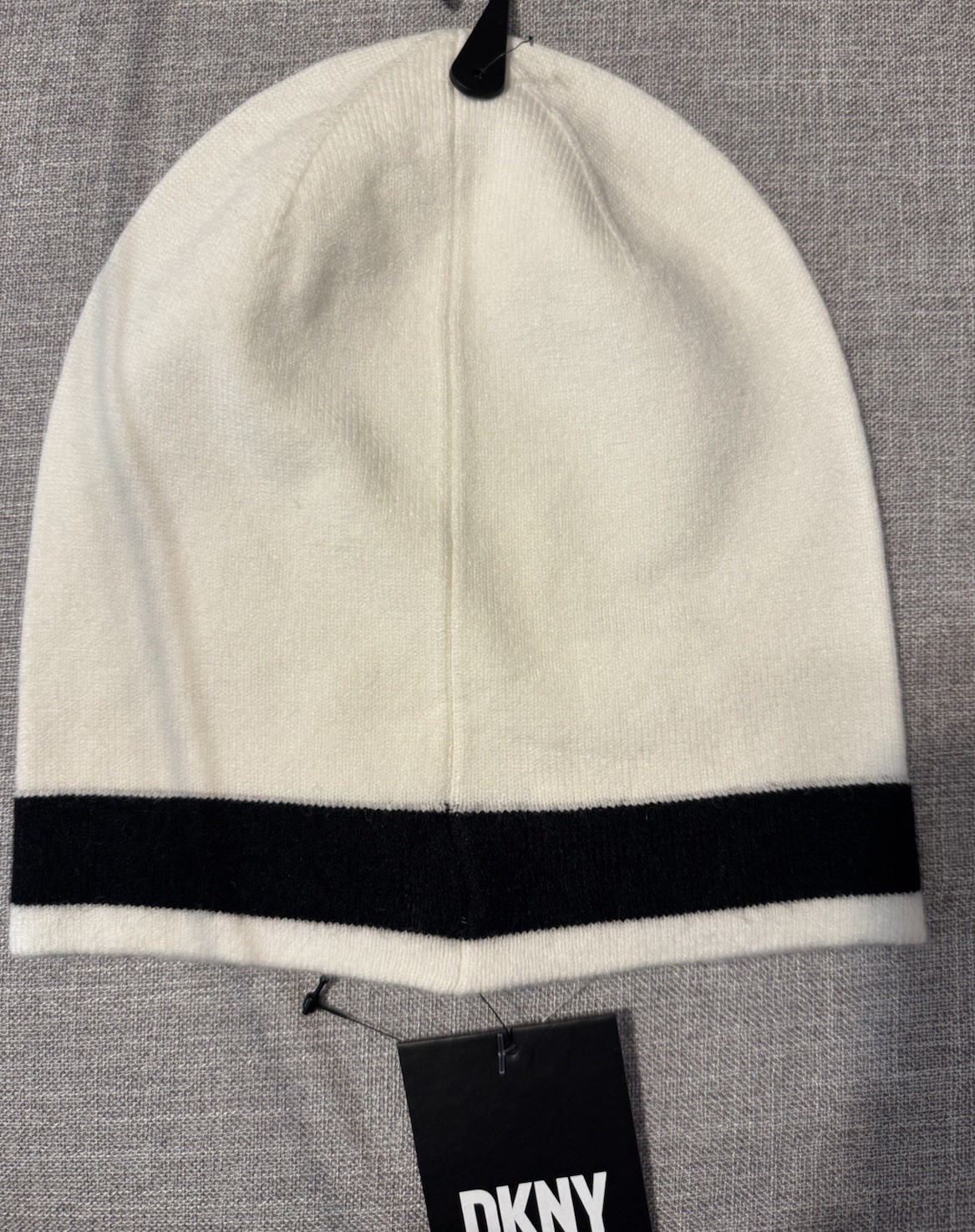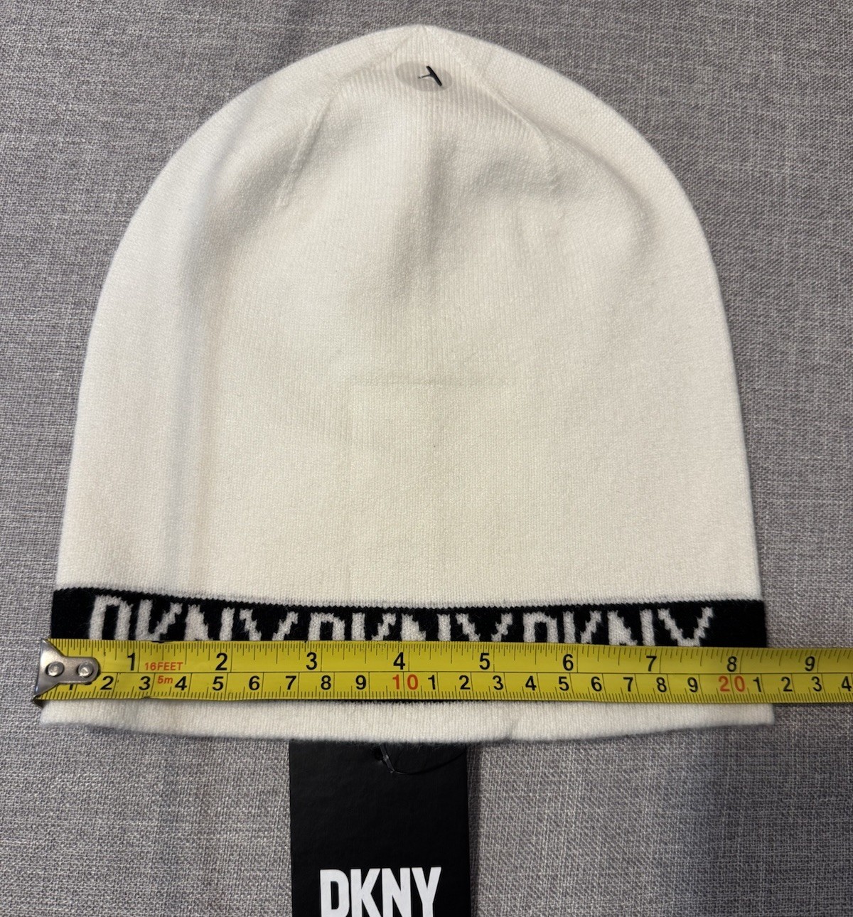New DKNY Ivory Black Logo Knit Beanie Hat One Size Unisex Men Women