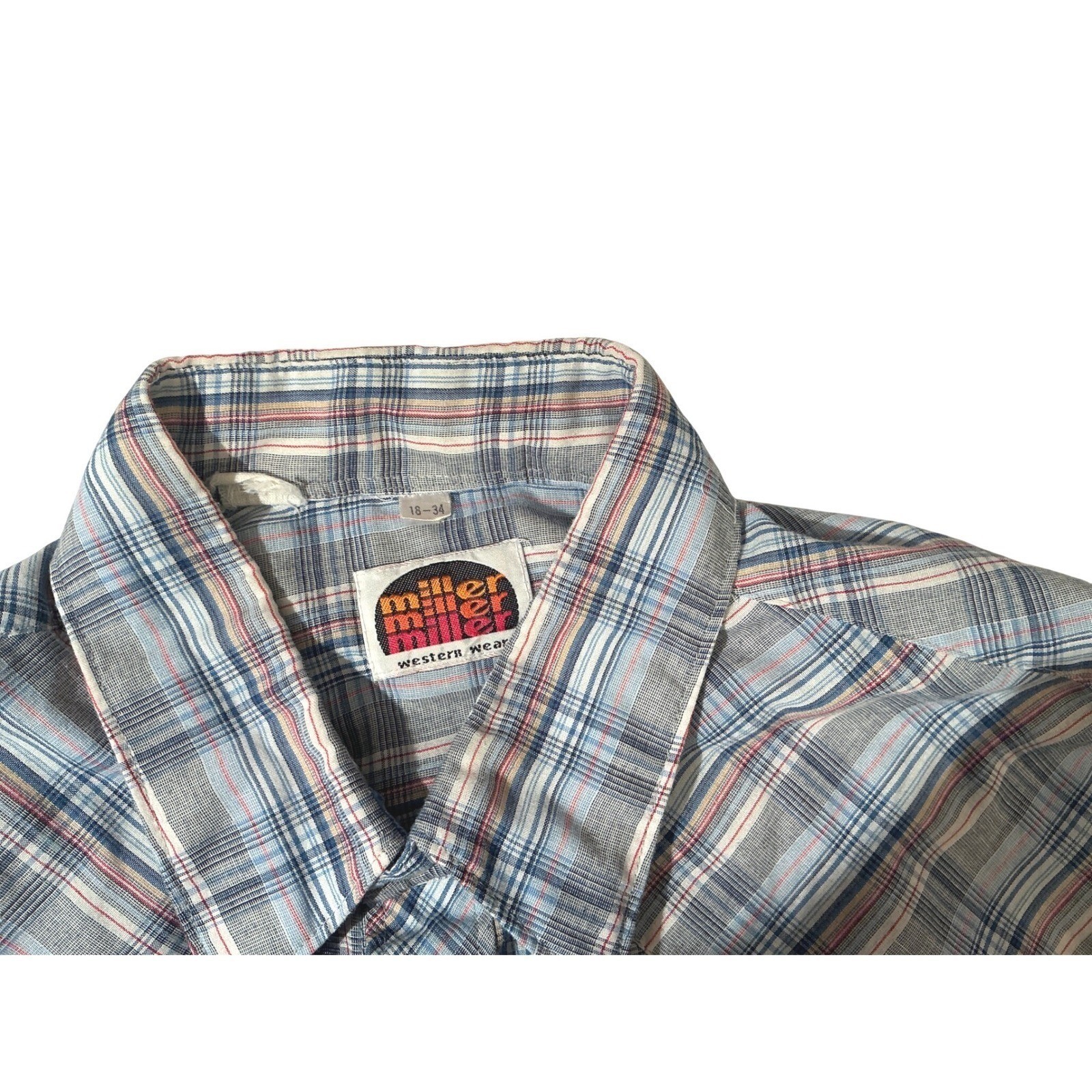 Miller Western Wear Mens Plaid Pearl Snap Shirt Vintage Blue Grey Red 18-34