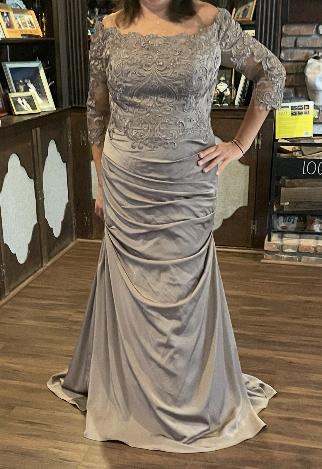 как выглядит Taupe Off-Shoulder Lace Embellished Mother of the Bride Dress 3/4 Sleeve фото