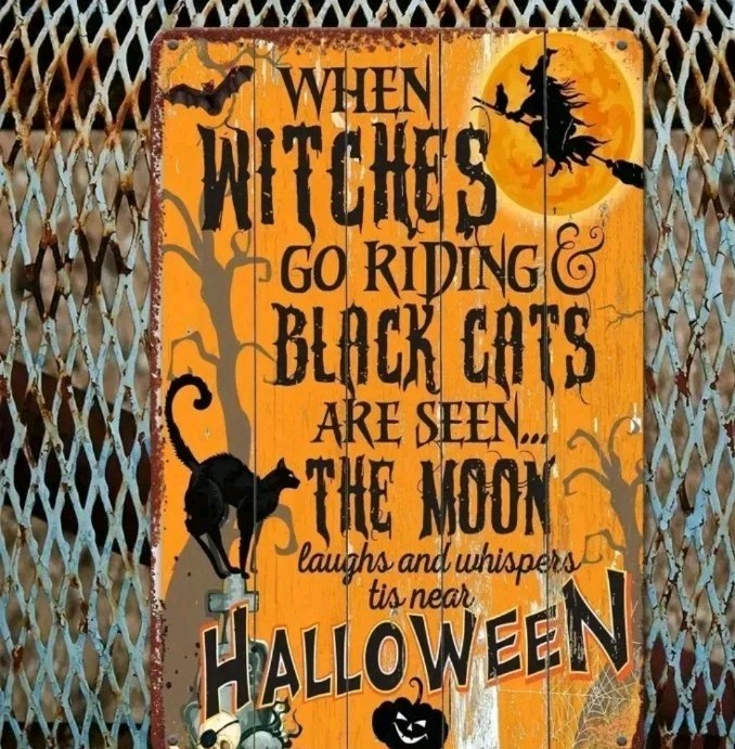 Halloween Black Cat Sign Metal Tin 8x12 Pumpkin Witch Hat Autumn Rustic Wall Dec