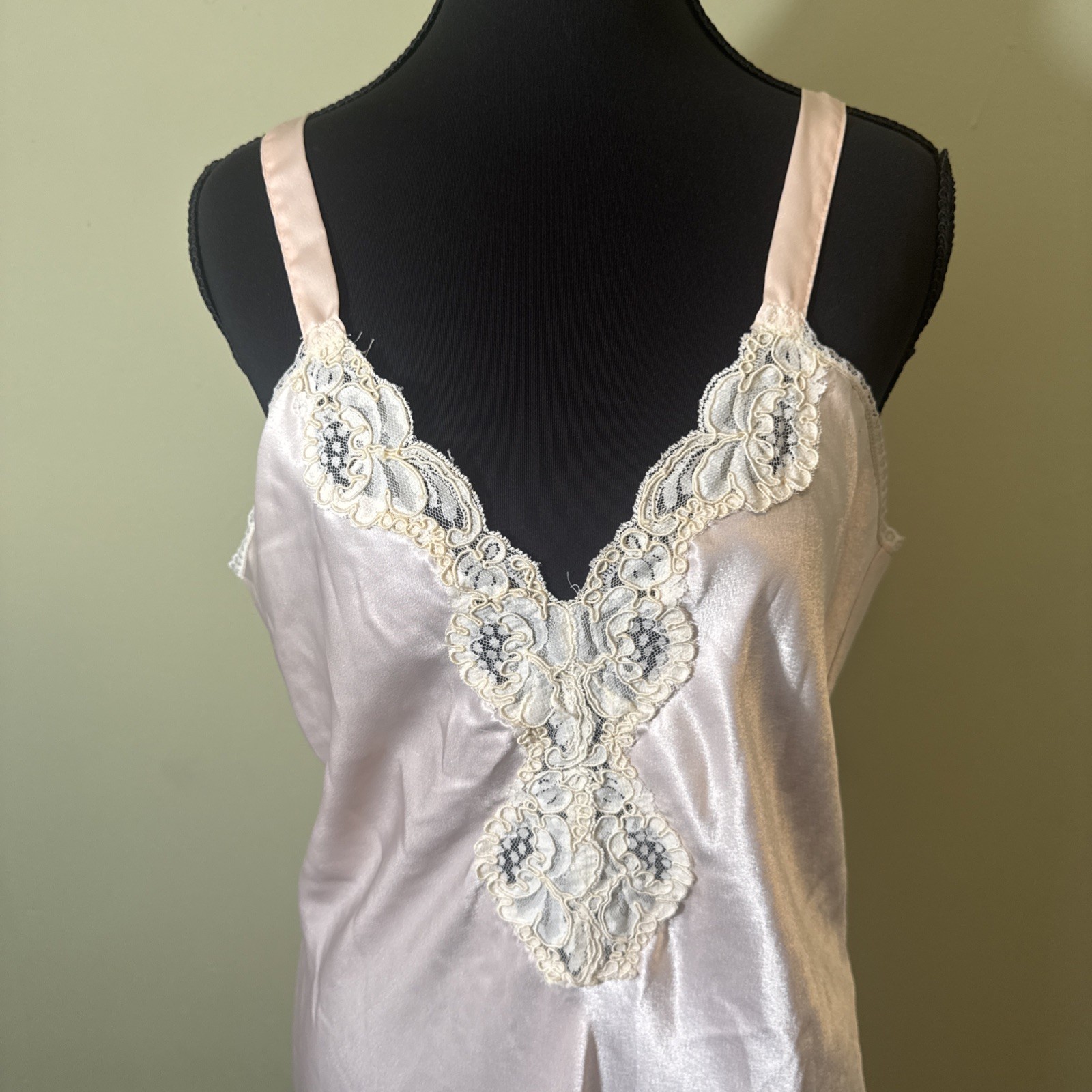 как выглядит Vintage Val Mode Nightgown Pink Satin Long Lace Trim V-neck Croquette Fairy Med. фото