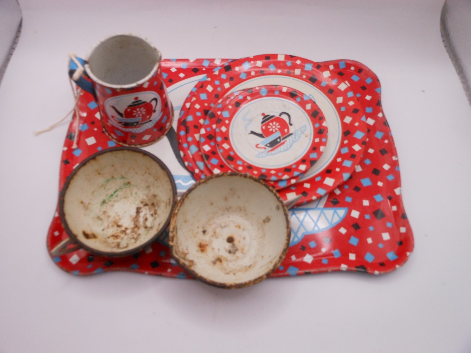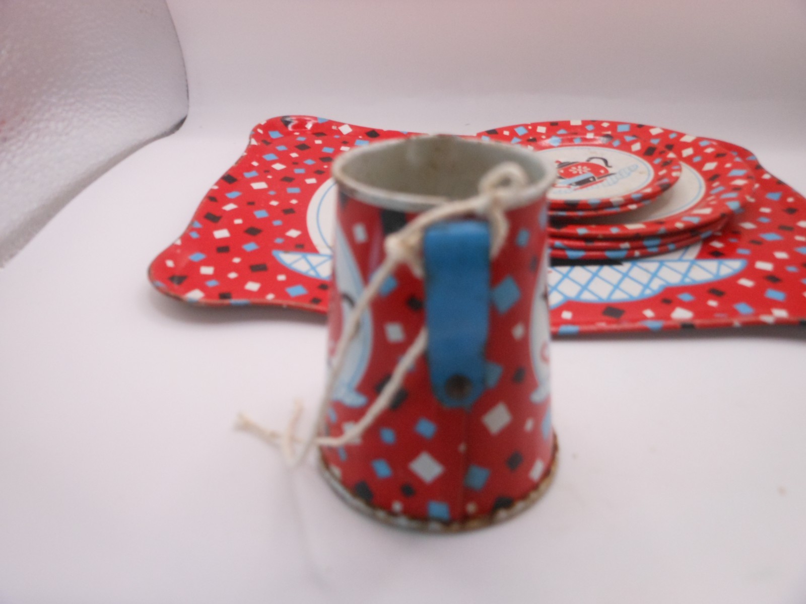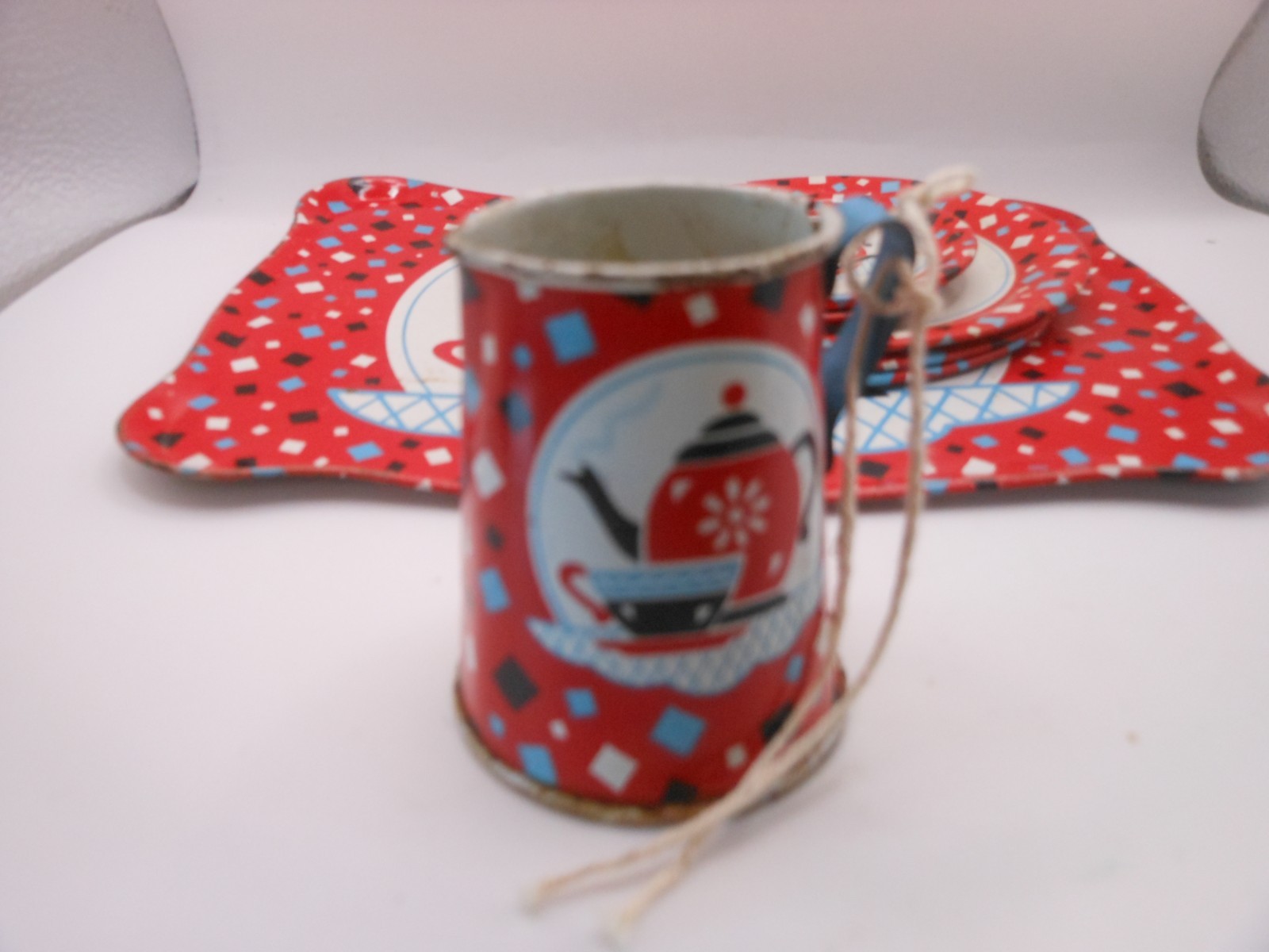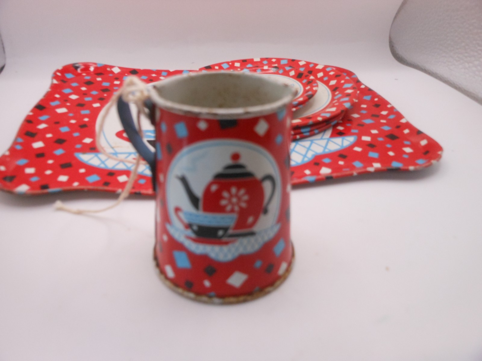 как выглядит 10 Pc Vtg OHIO ART Childrens Tin Tea Set: Red Confetti w/Teapot/Cup Design фото