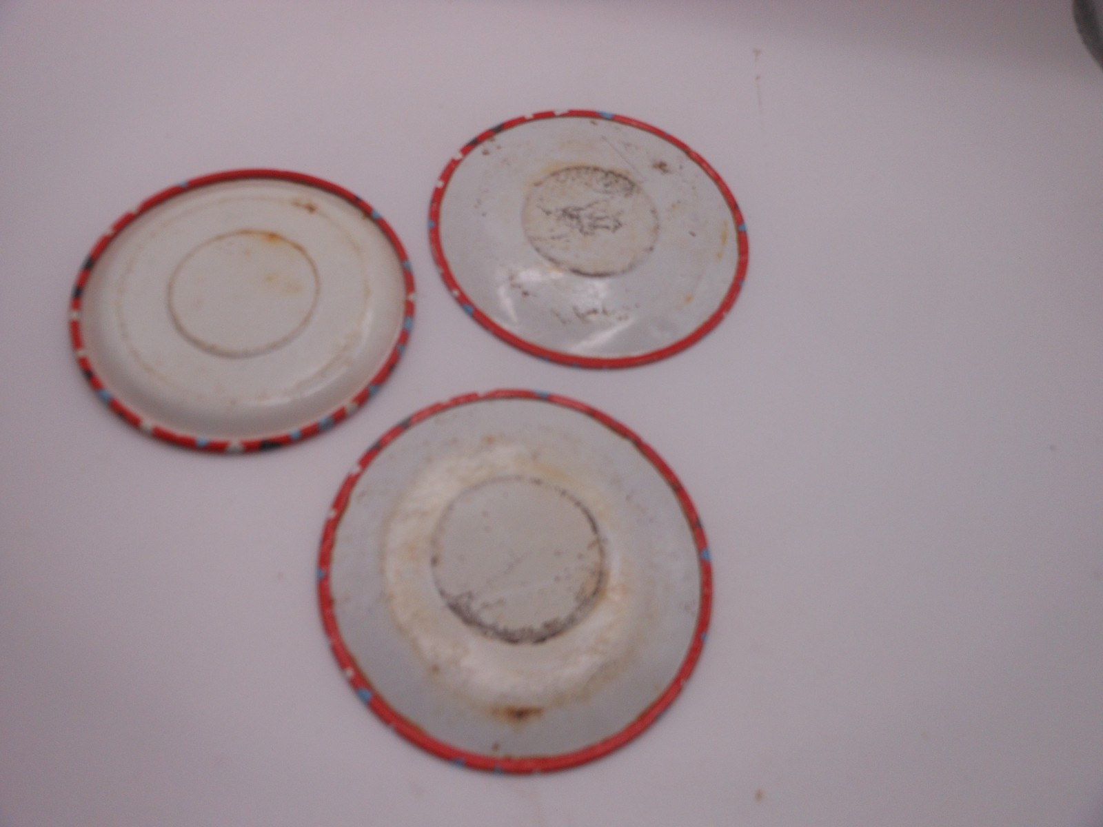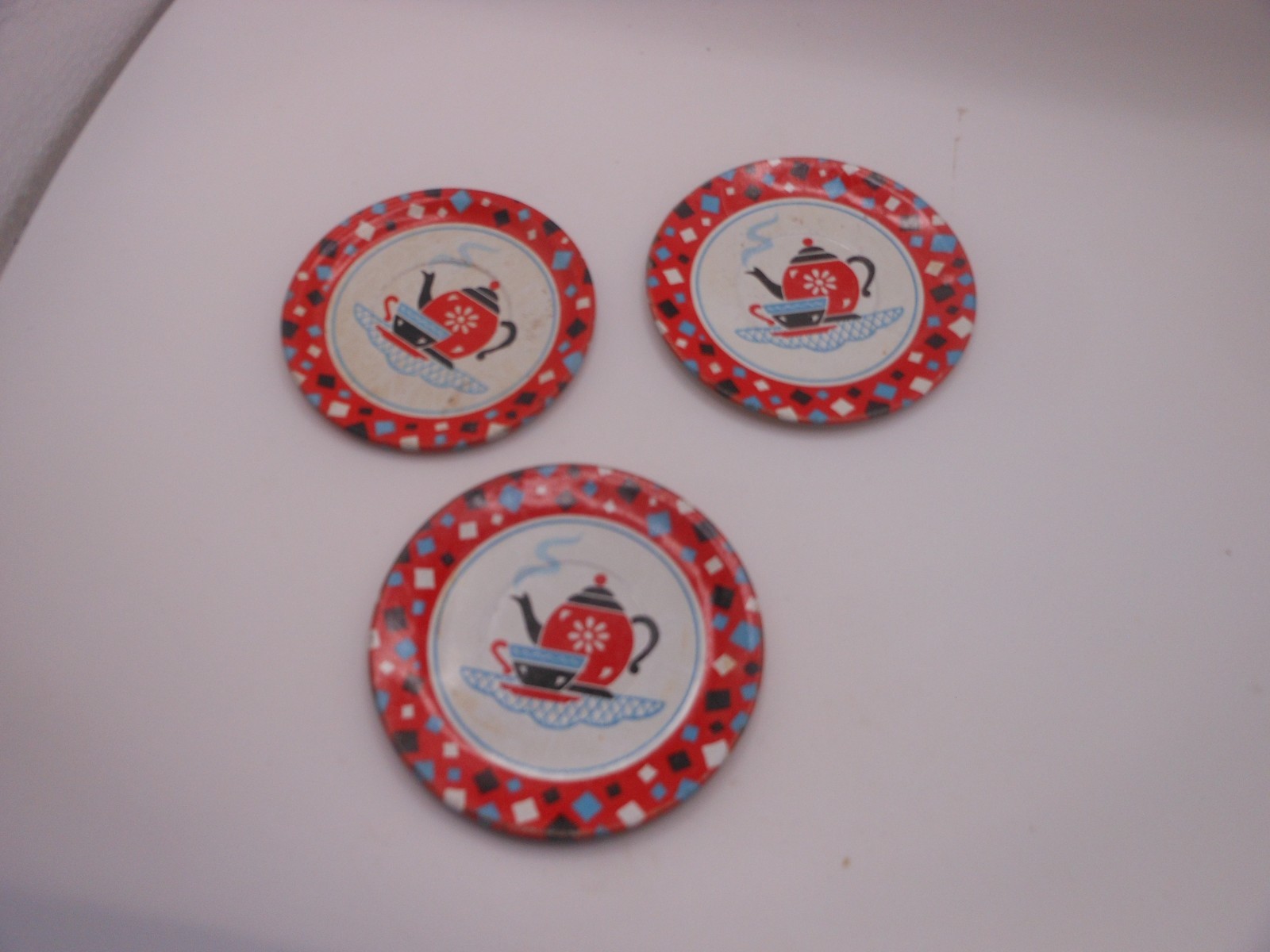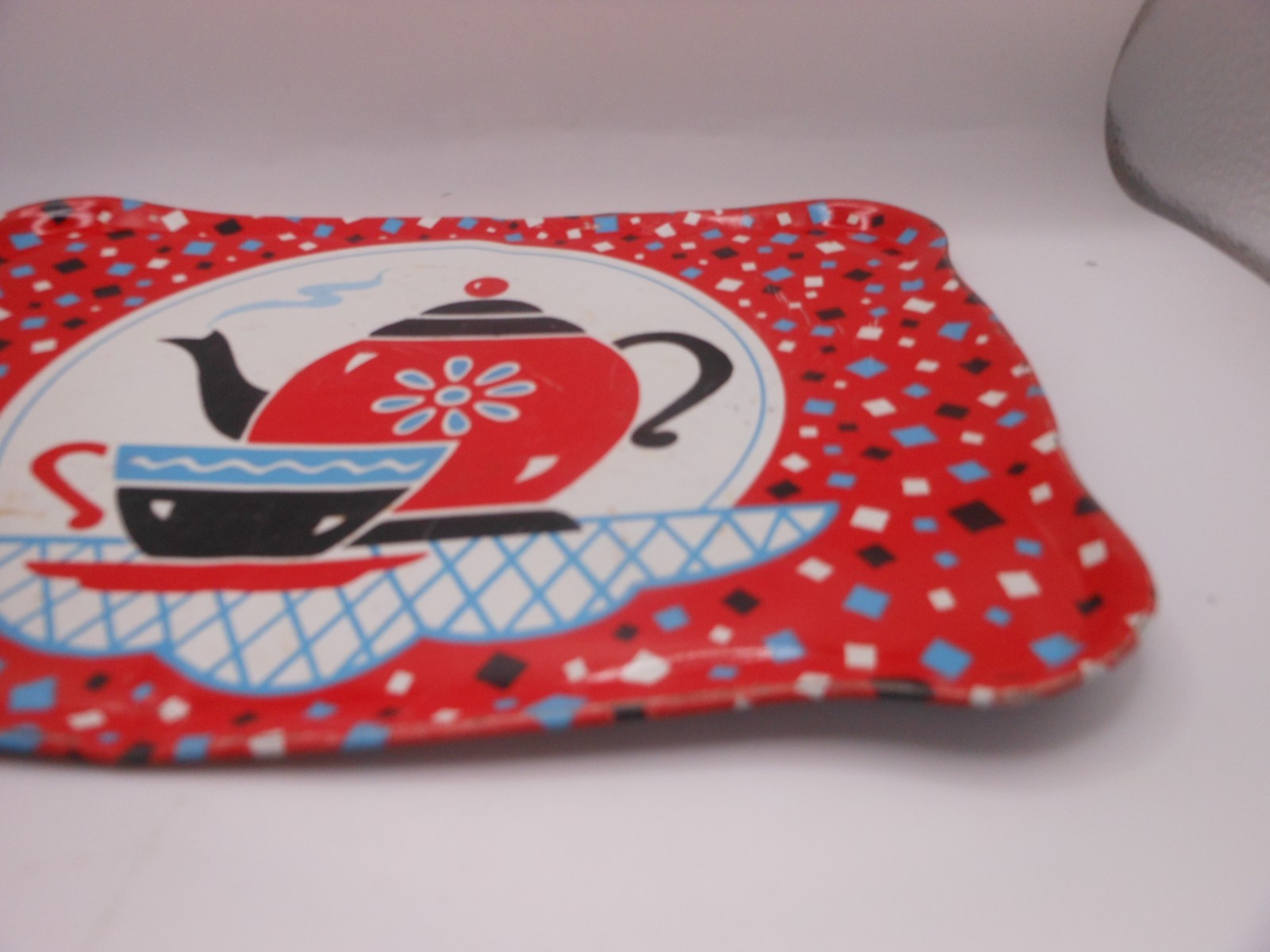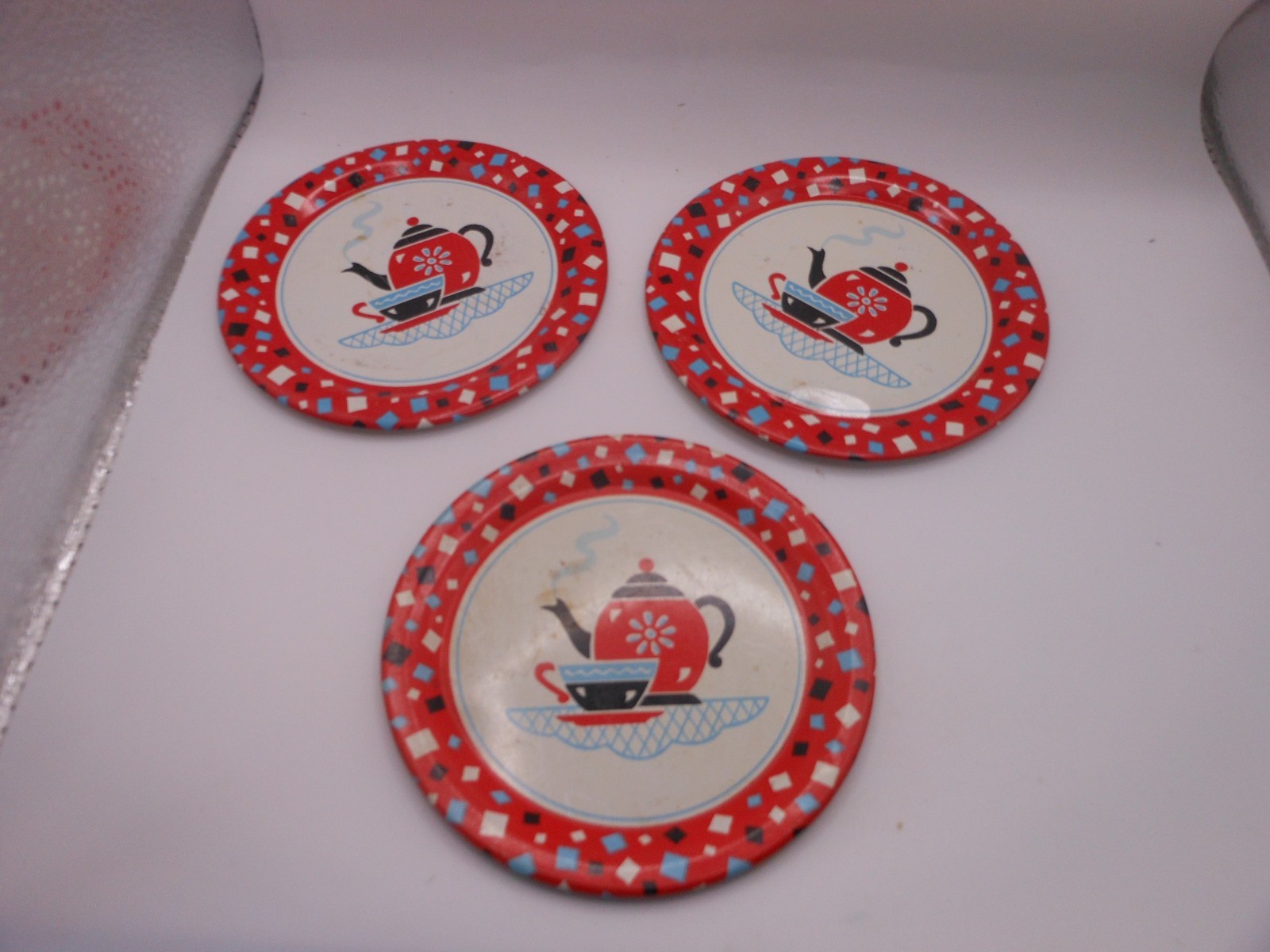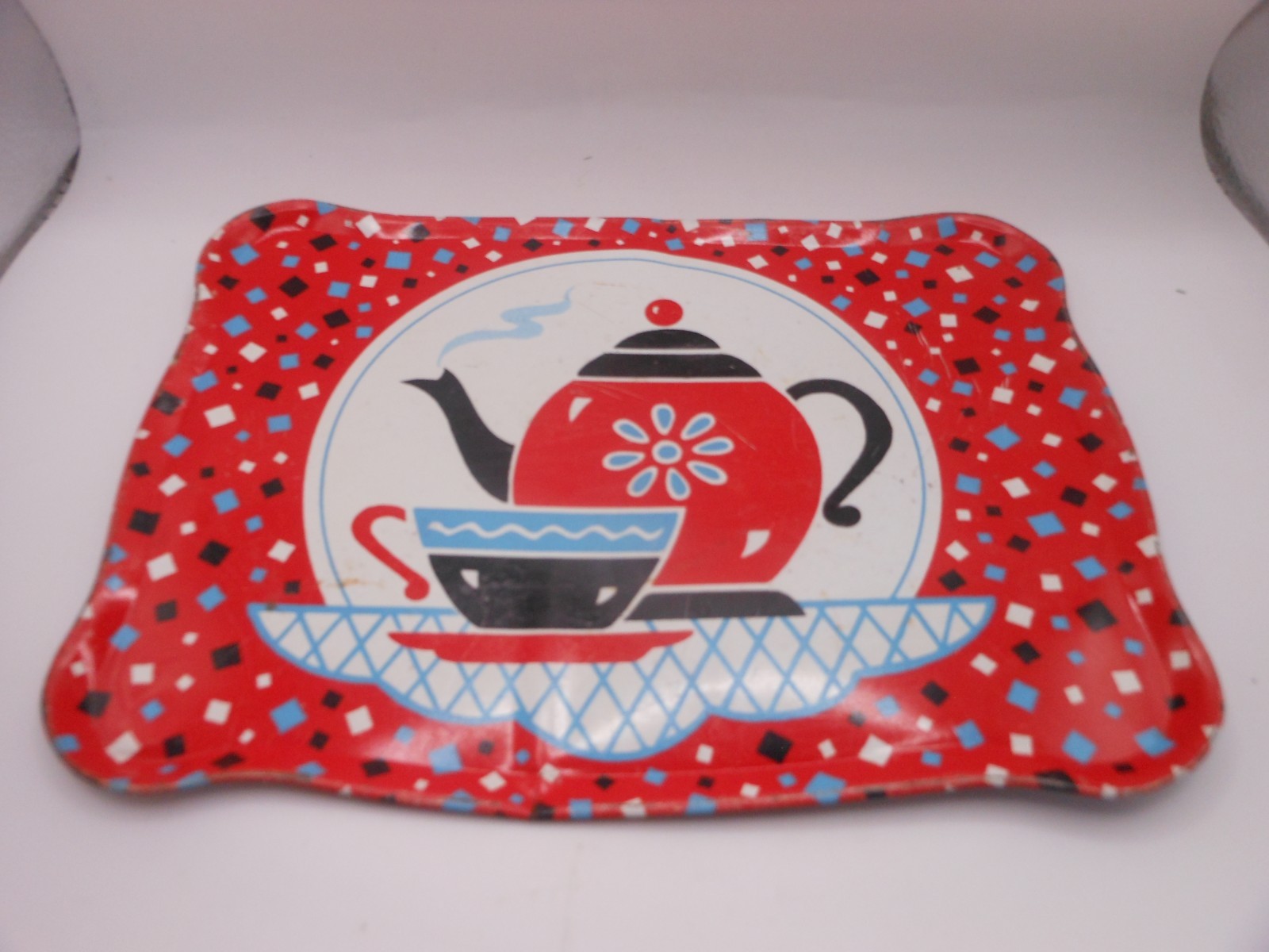 как выглядит 10 Pc Vtg OHIO ART Childrens Tin Tea Set: Red Confetti w/Teapot/Cup Design фото