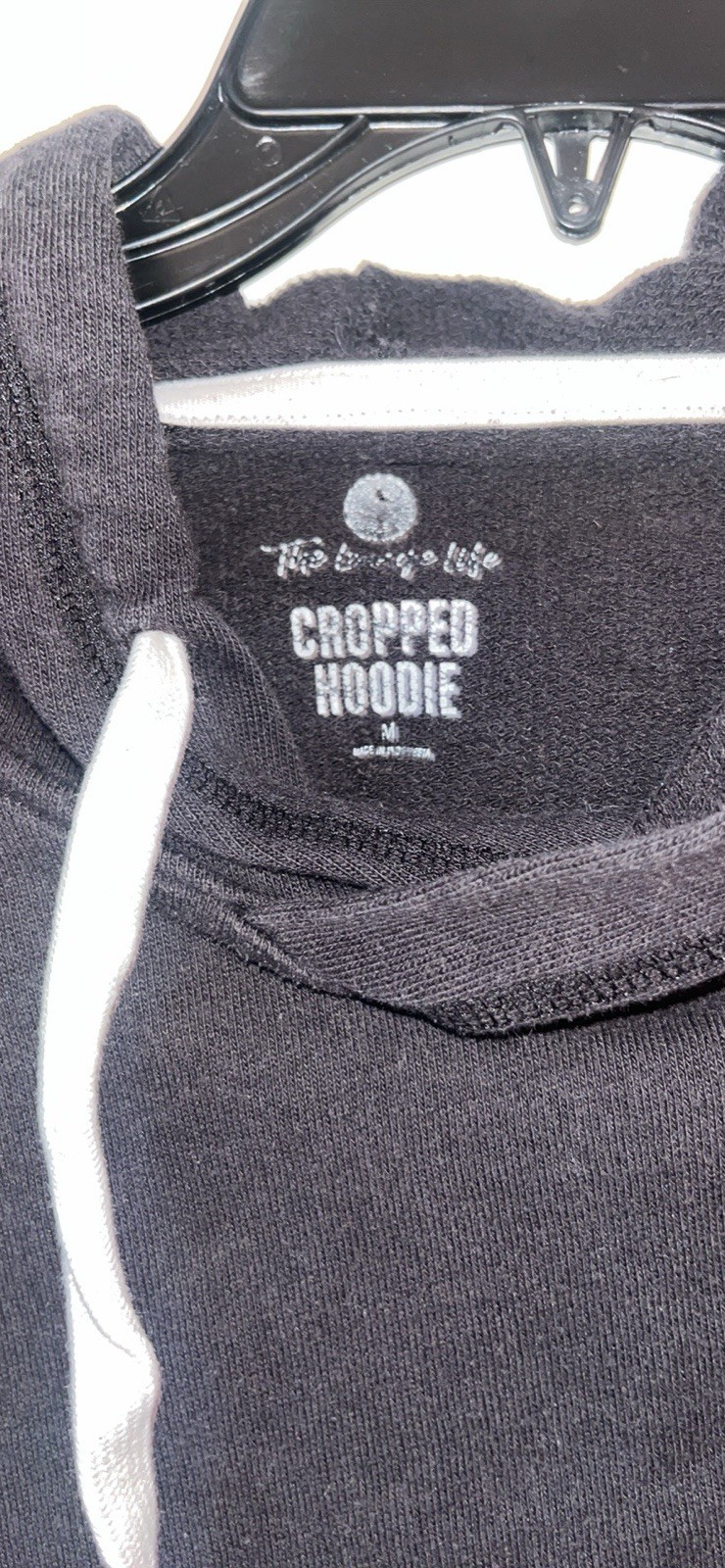 как выглядит Womens black cropped hoodie featuring long sleeves and white drawstrings фото