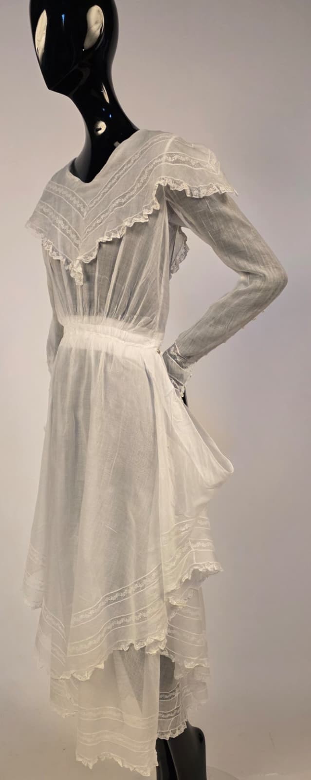 EDWARDIAN TEENS WHITE BATISTE TEA DRESS W VALENCIENNES LACE FLARED SIDE SKIRT
