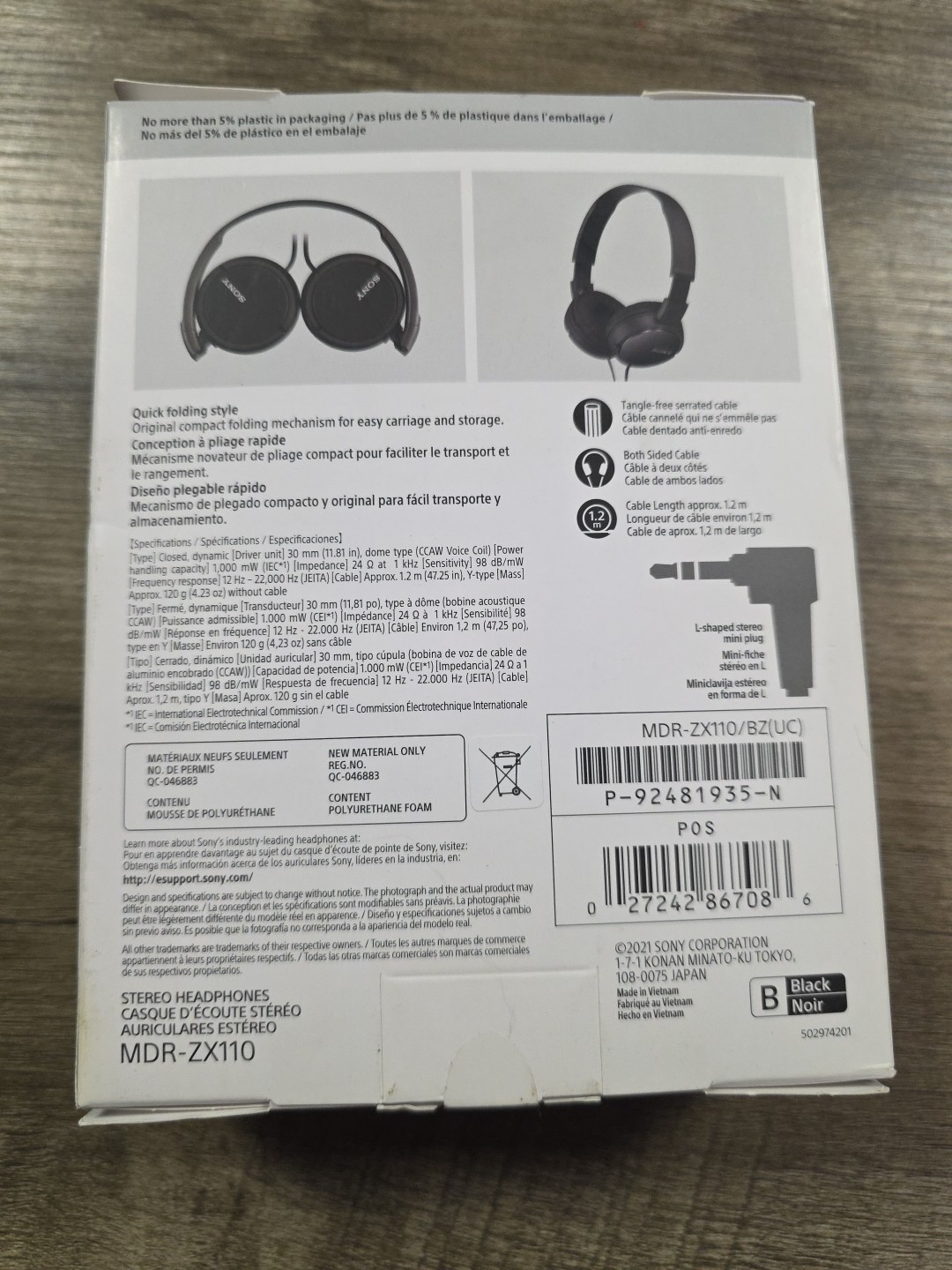 Sony MDR-ZX110 - Black - Wired Over Ear - Quick Folding Style - New - Sealed Box
