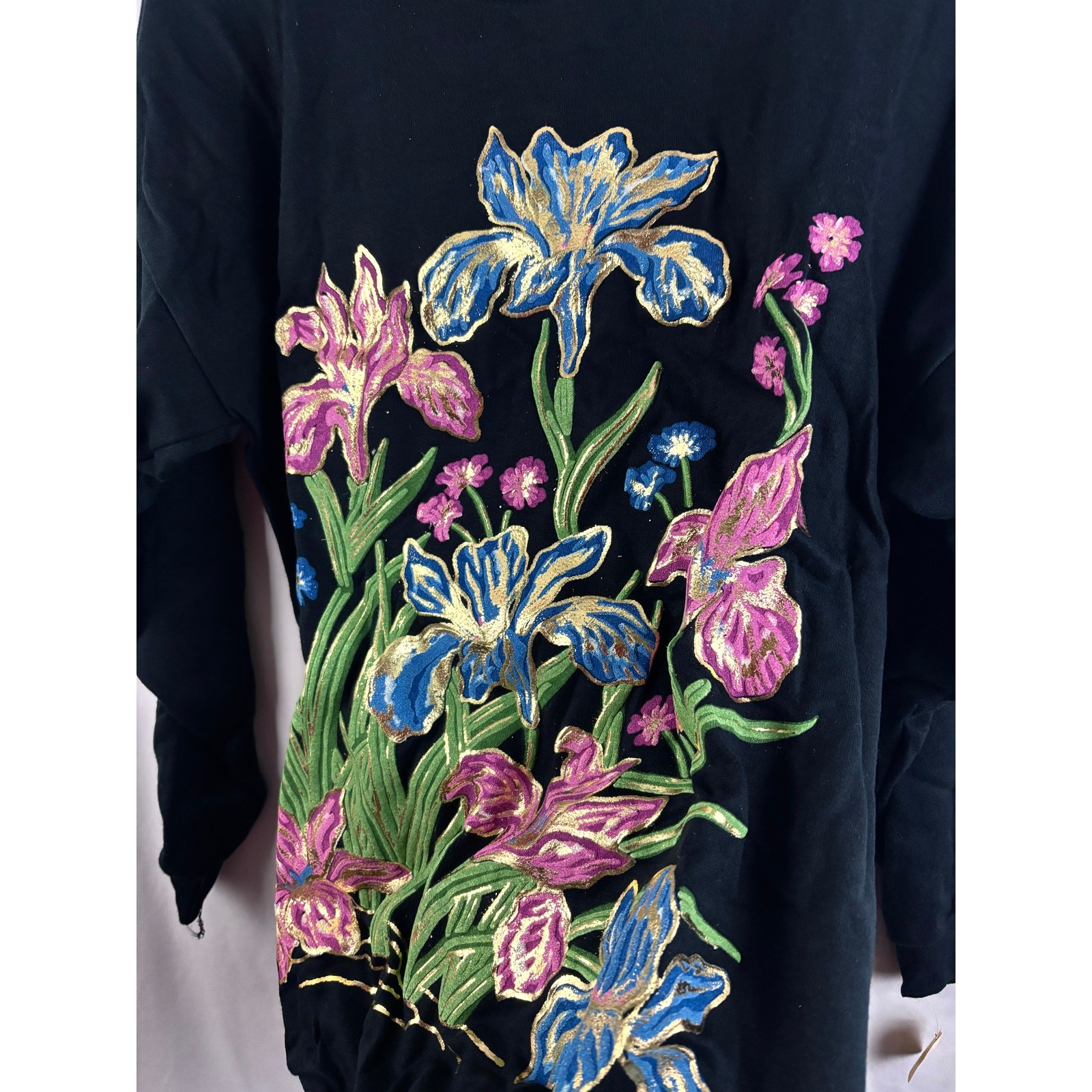 как выглядит Vtg 90s Black Hand-Painted Iris Floral Sweatshirt Gold Paint Grandma Core M USA фото