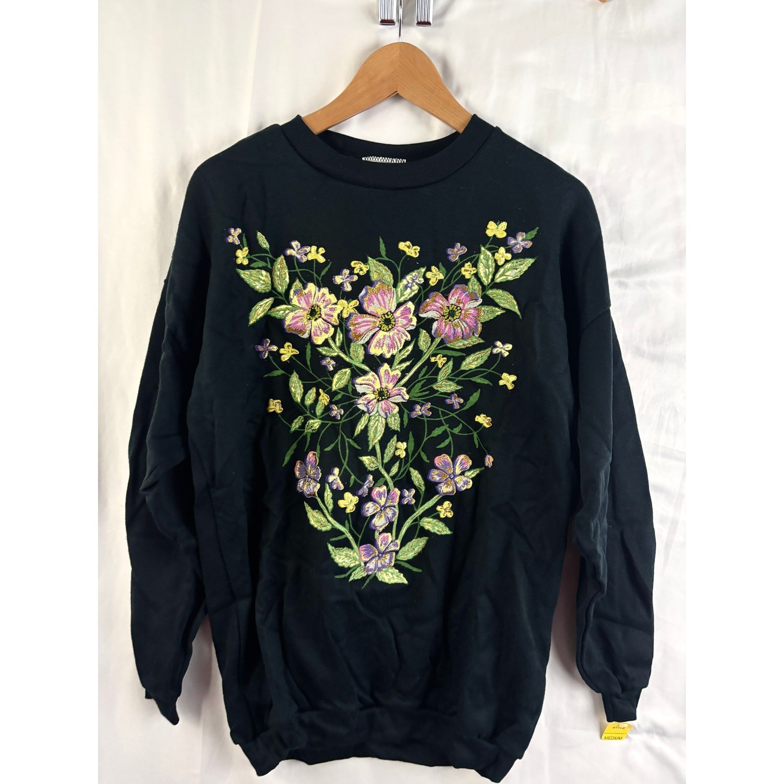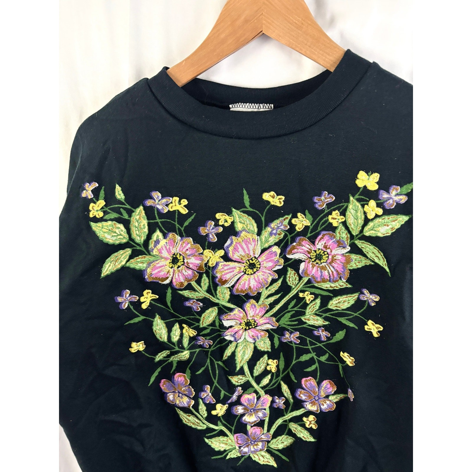 как выглядит Vtg 90s Black Hand-Painted Floral Sweatshirt Gold Shimmer Grandma Core M USA фото