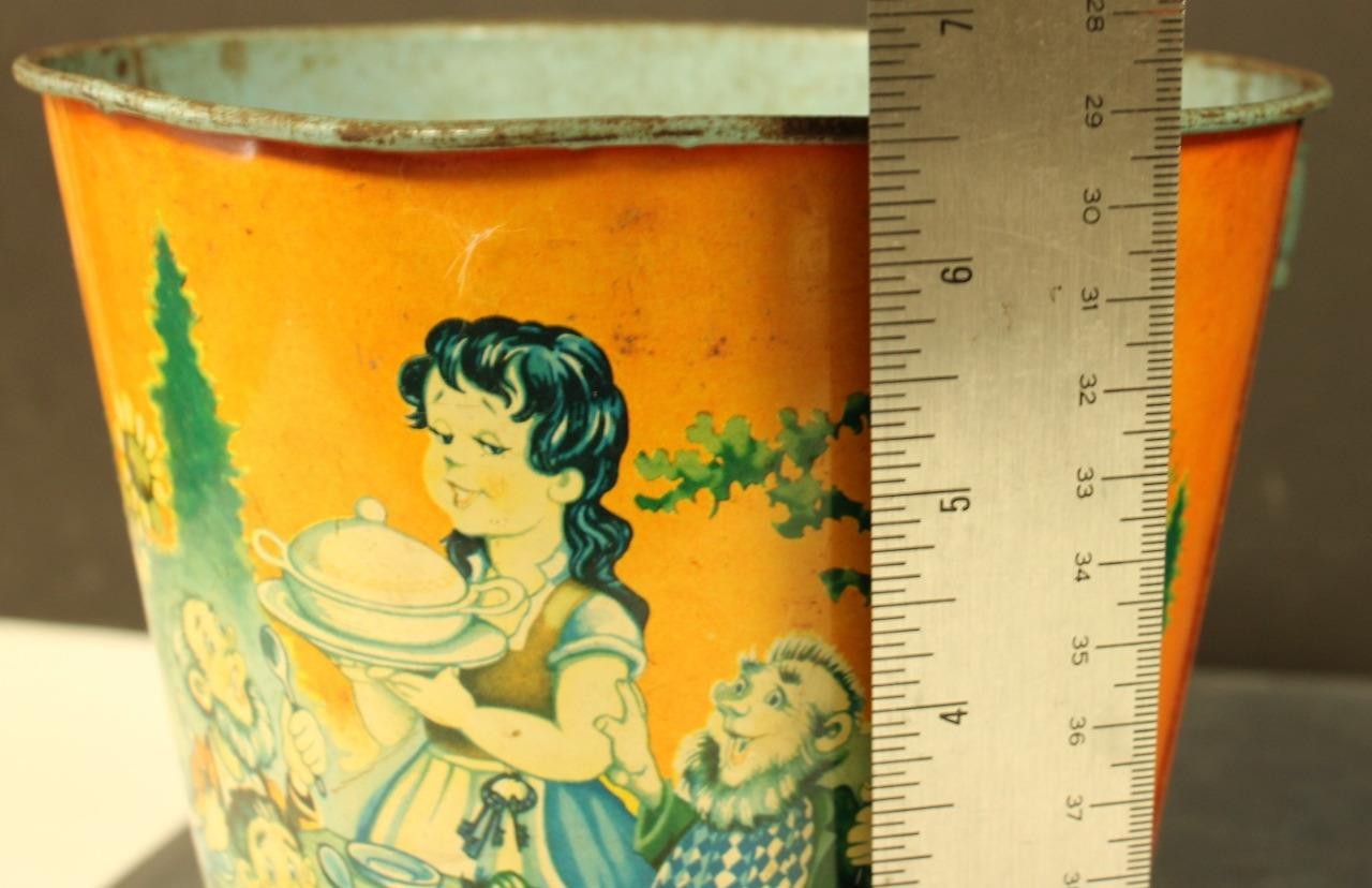 Nursery Rhyme Sand Pail Western Germany 6 7/16 tall 7 Dwarfs Big Bad Wolf Dra4