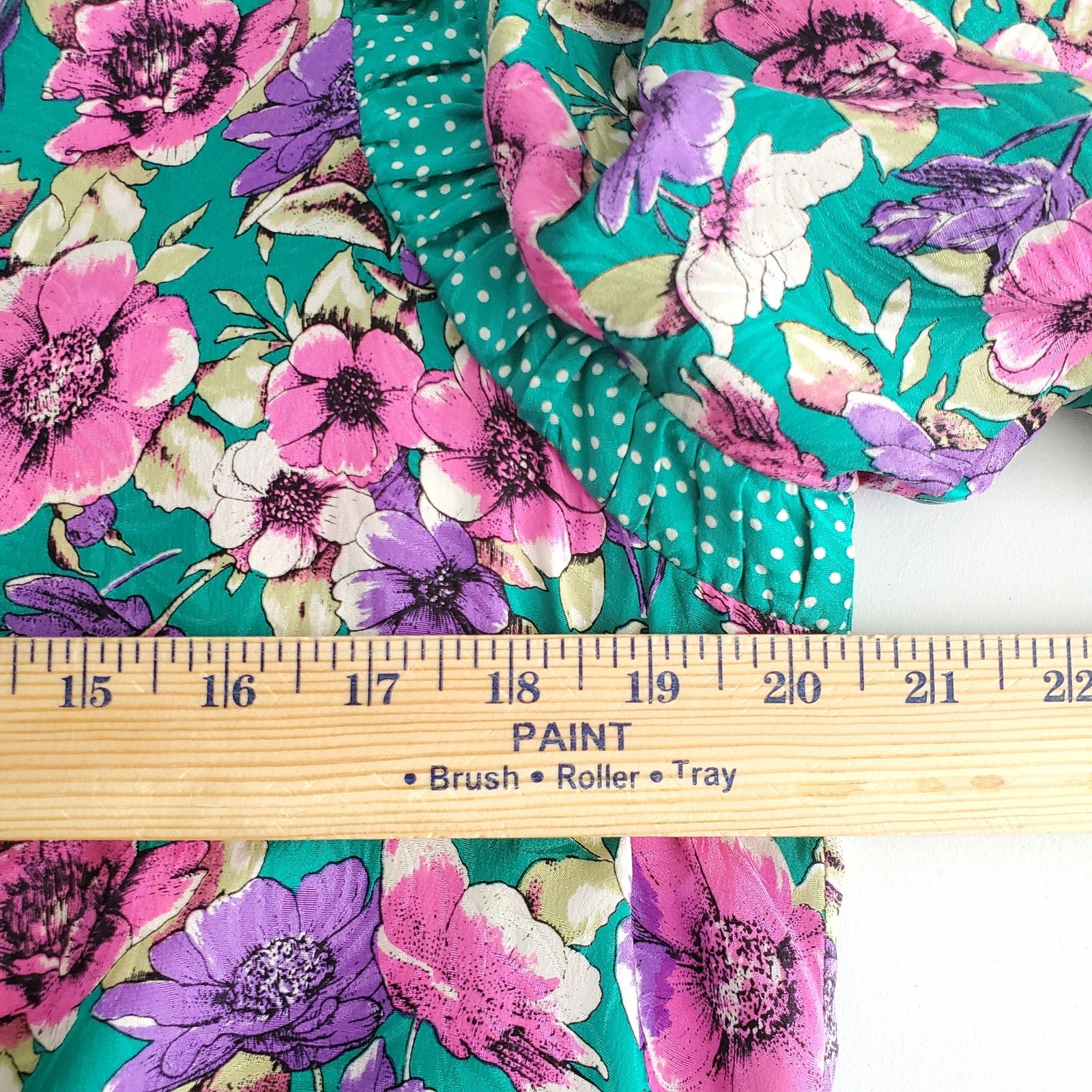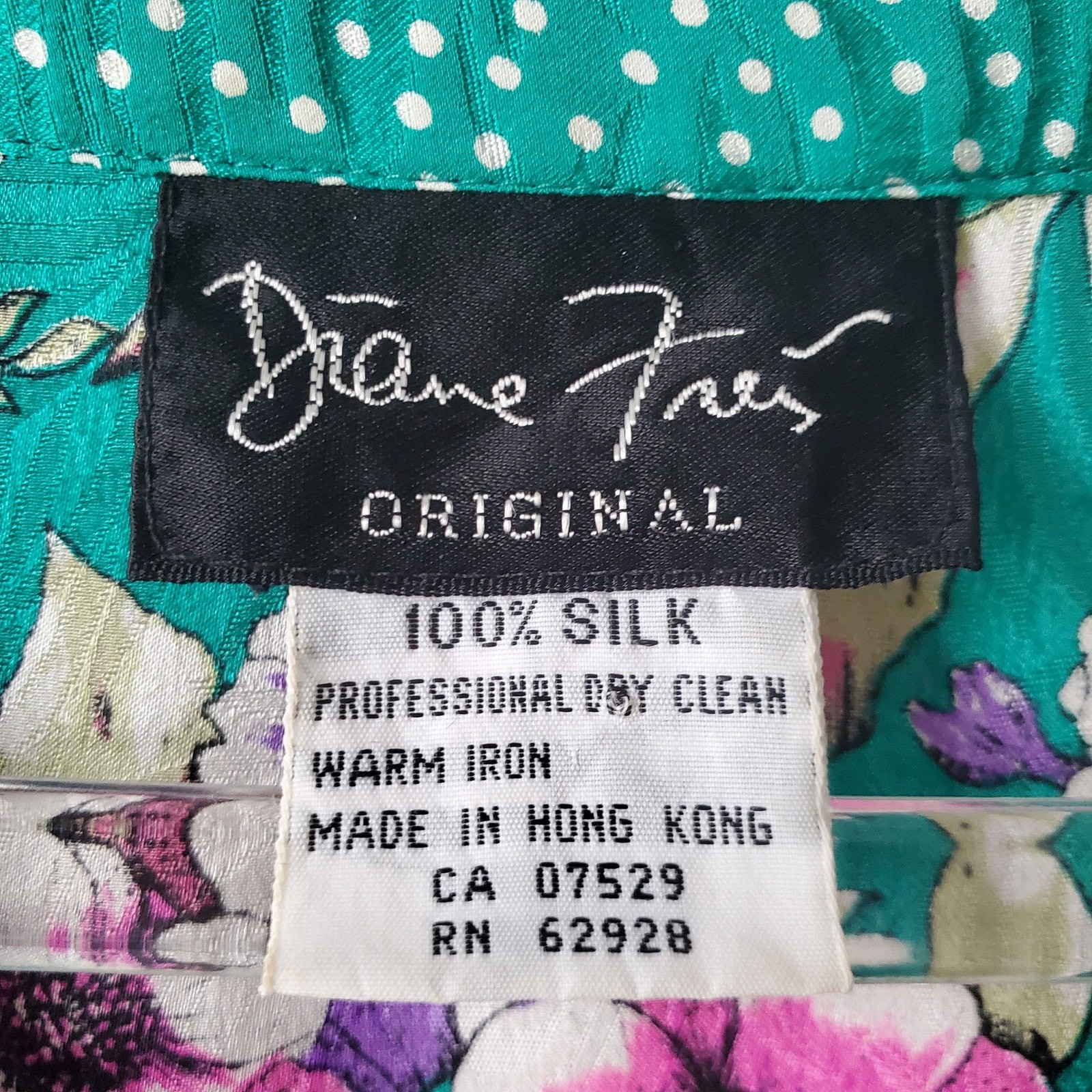 Women 80s Diane Freis Silk Pink Teal Blue Floral Blouse M L Colorful Retro Artsy
