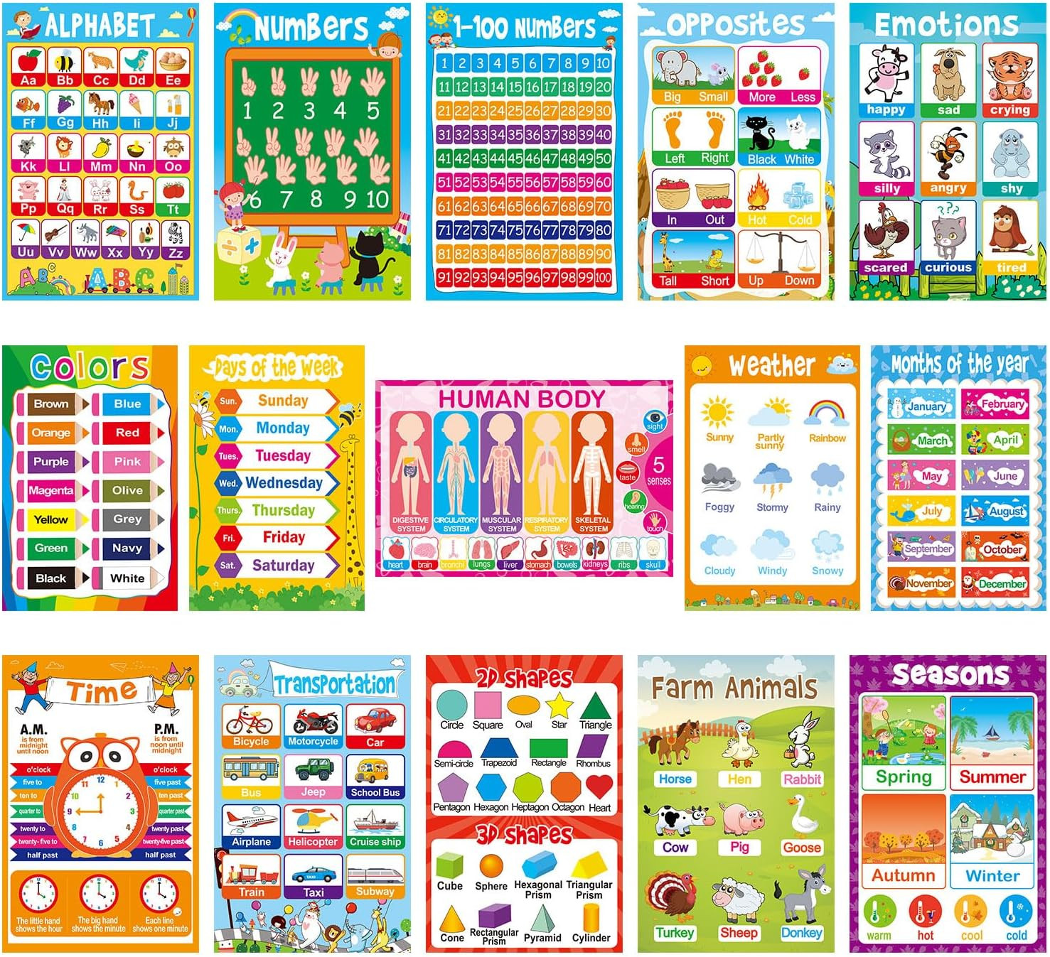 15 Educational Posters for Toddlers Kids Learning Alphabet Numbers Shapes Colors