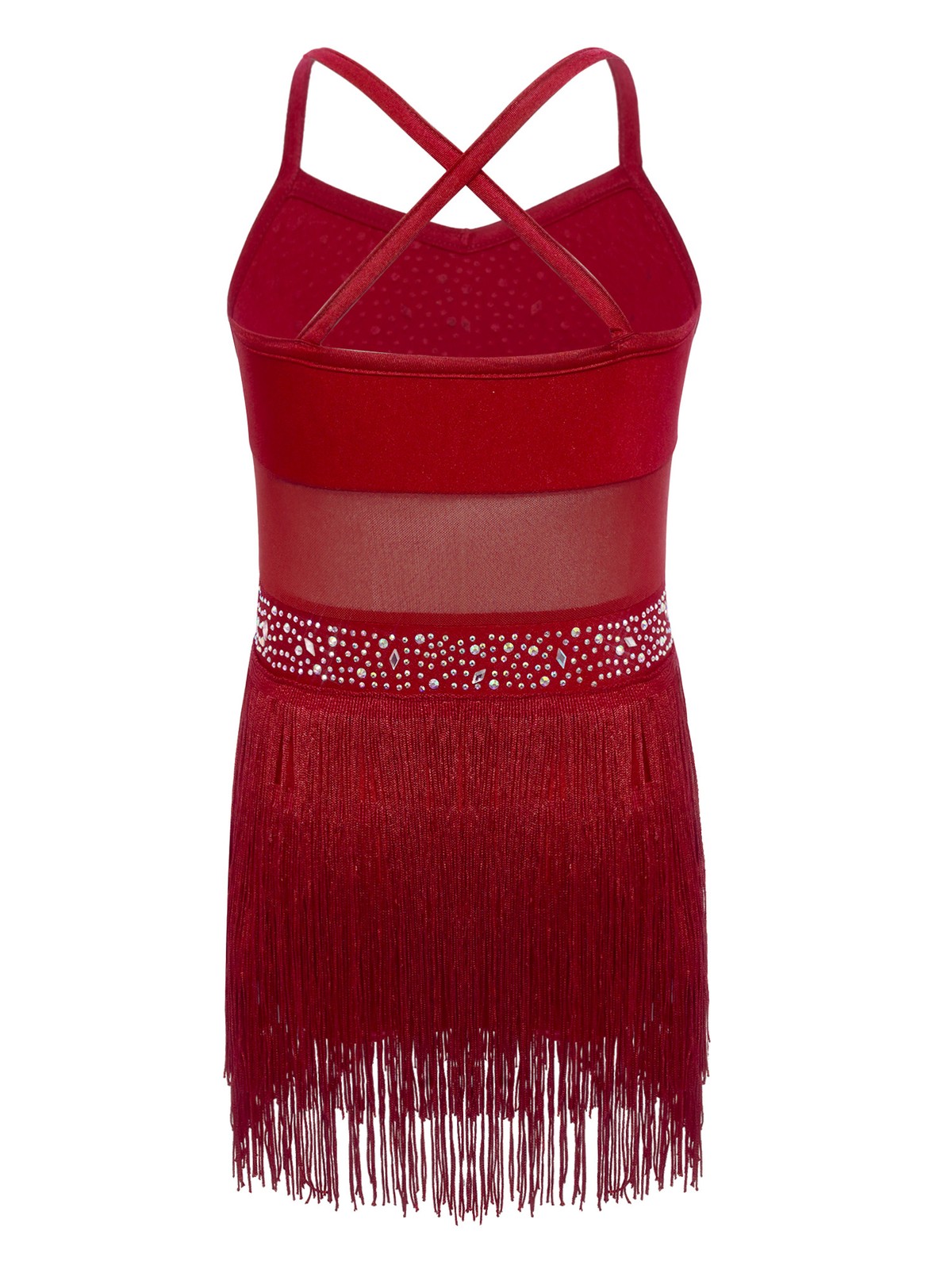 Kids Girls Dance Dress Fringe Tassel Skirted Leotard Ballroom Outfit with Gloves