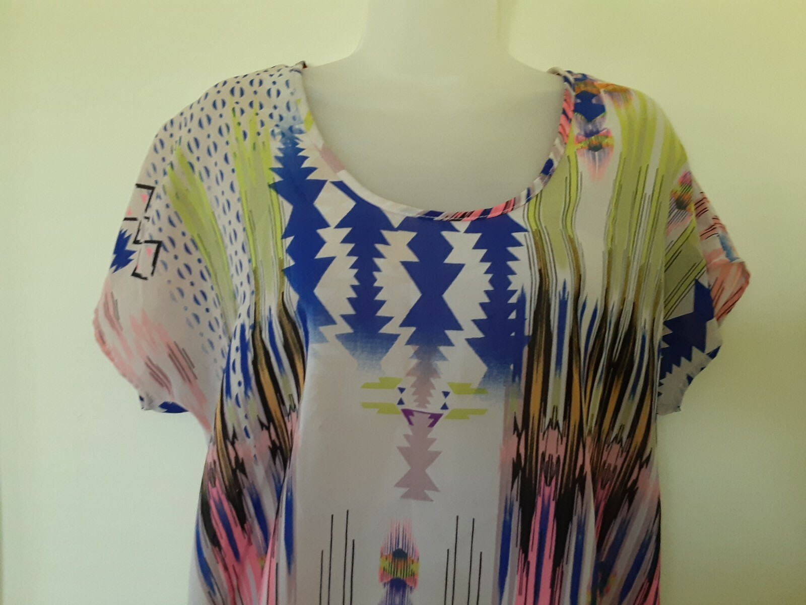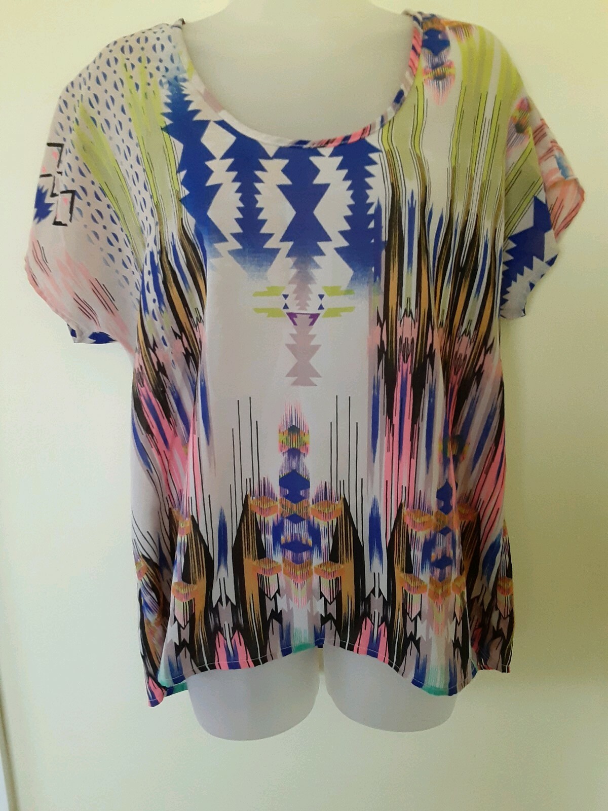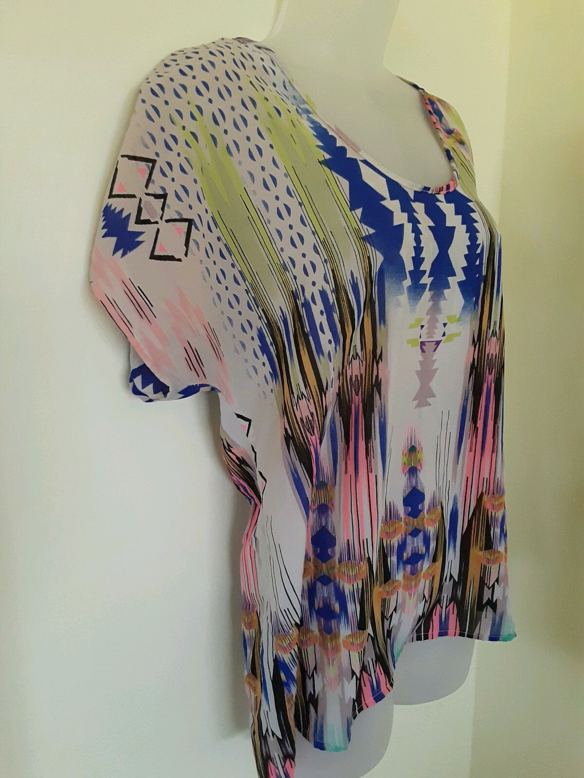 как выглядит Ladies Blouse Vintage Long Vibrant Multi Tribal Geometric Artisan Top SZ L EUC фото