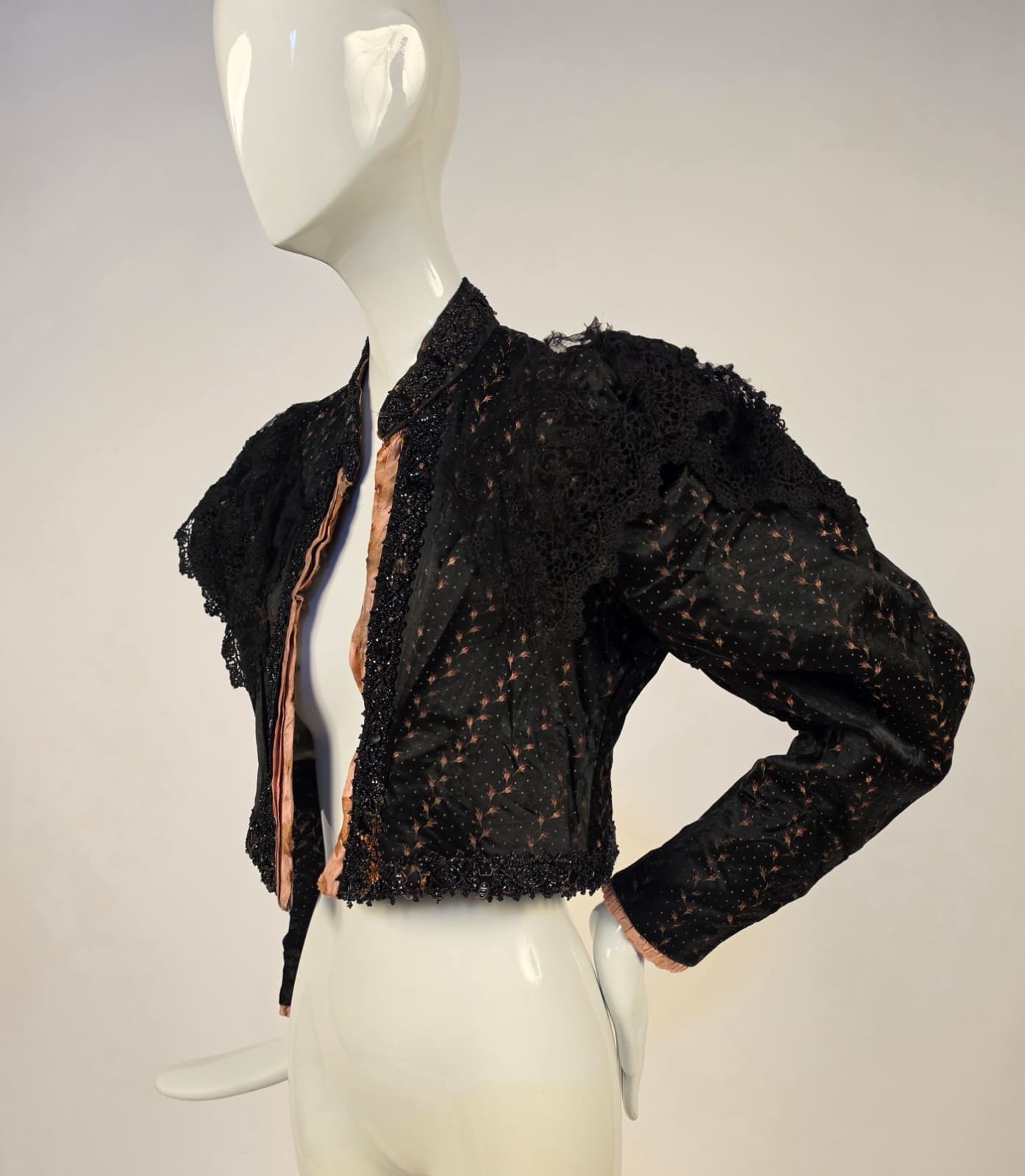 VICTORIAN 19TH C ROSEBUD PATTERN SILK BODICE W PUFF SLEEVES