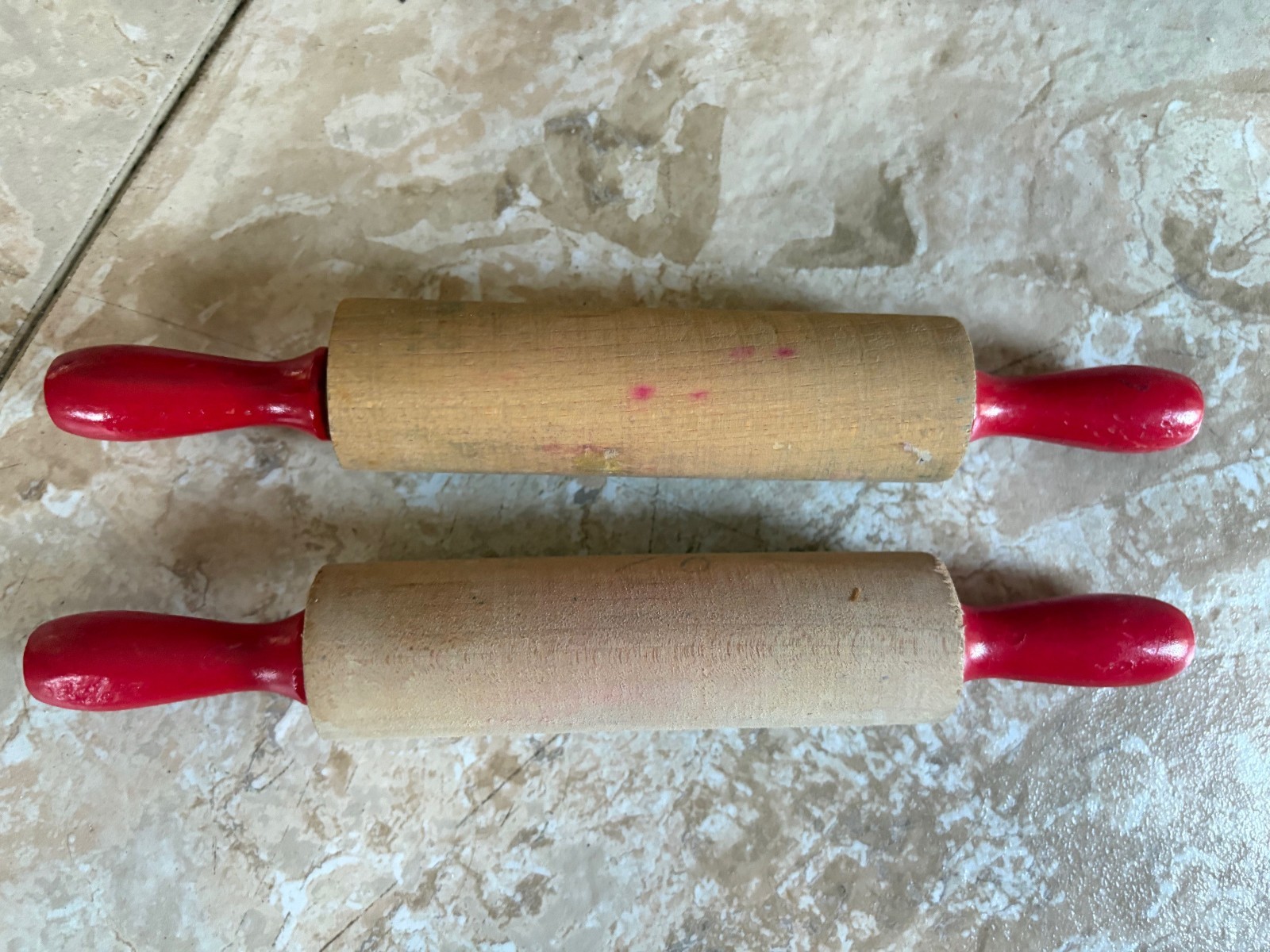 3 Vintage Play Toy Kitchen Wooden Baking Rolling Pins 7.5 and 10 Red Handles