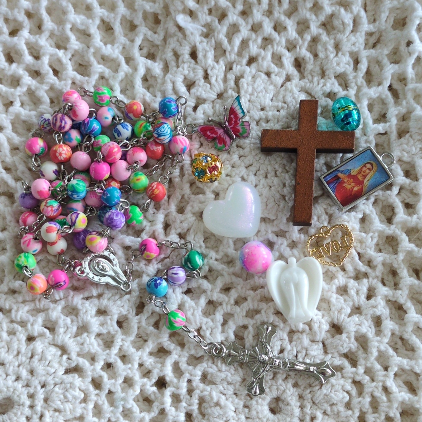 • Handmade Colorful Rosary with Wooden Cross, Charms, Decorative Tin, Mixed Mater