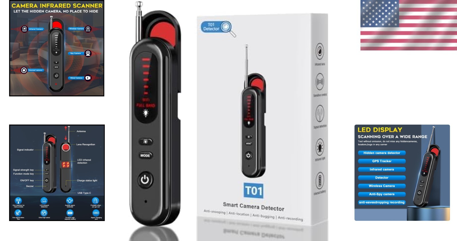 Особенности: Hidden Camera Detector, Camera Detection, GPS Tracker Detection, Bug Detection, RF Wireless Signal Scanning, Portable Design, User-Friendly Operation