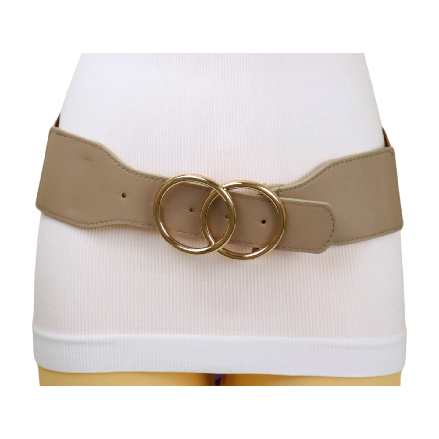 Women Beige Taupe Stretch Sleek Style Fashion Belt Gold Circle Buckle Size S M