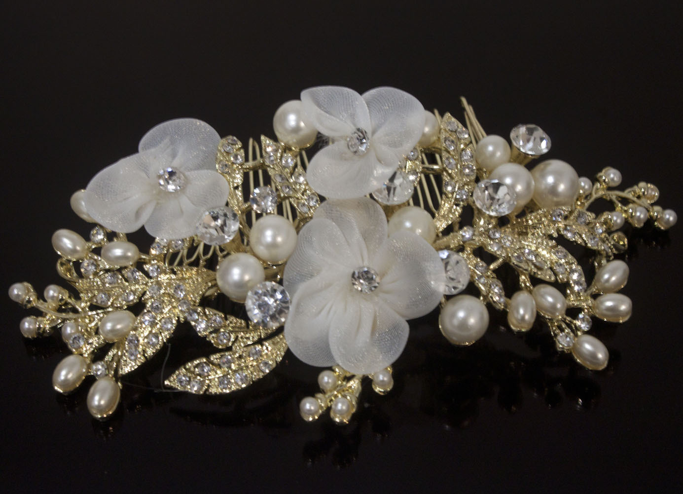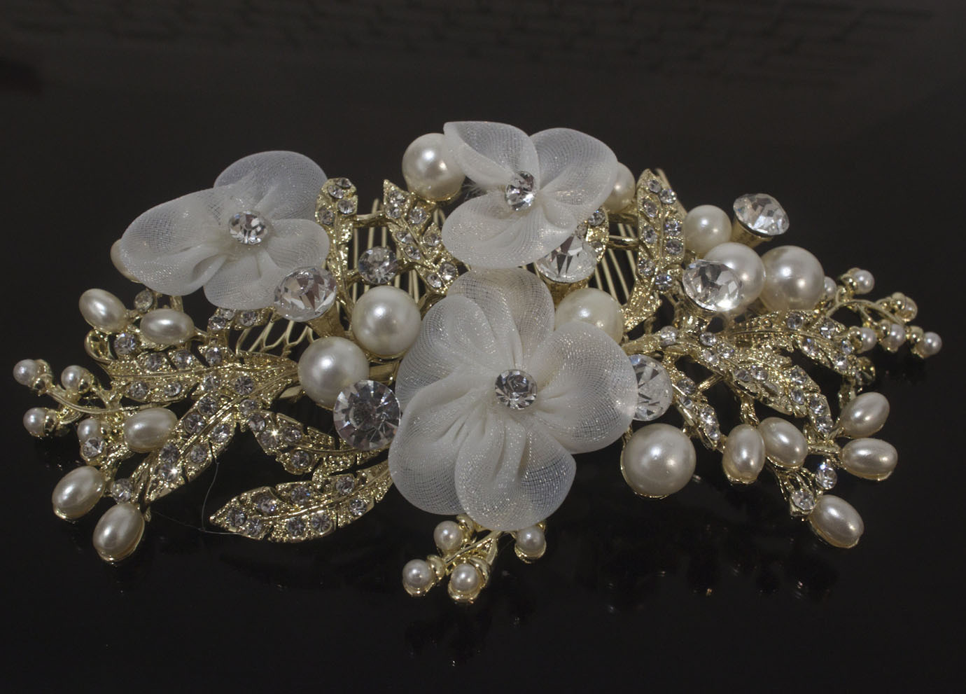 Vintage gold tone hair comb bridal wedding rhinestone with lace flowers ha305130