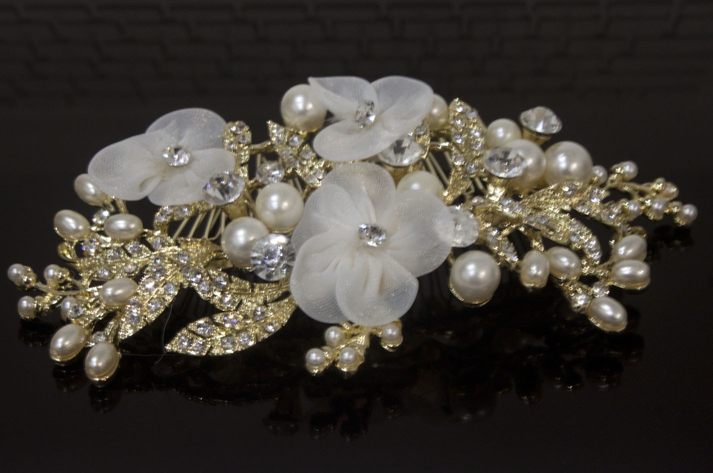 как выглядит Vintage gold tone hair comb bridal wedding rhinestone with lace flowers ha305130 фото
