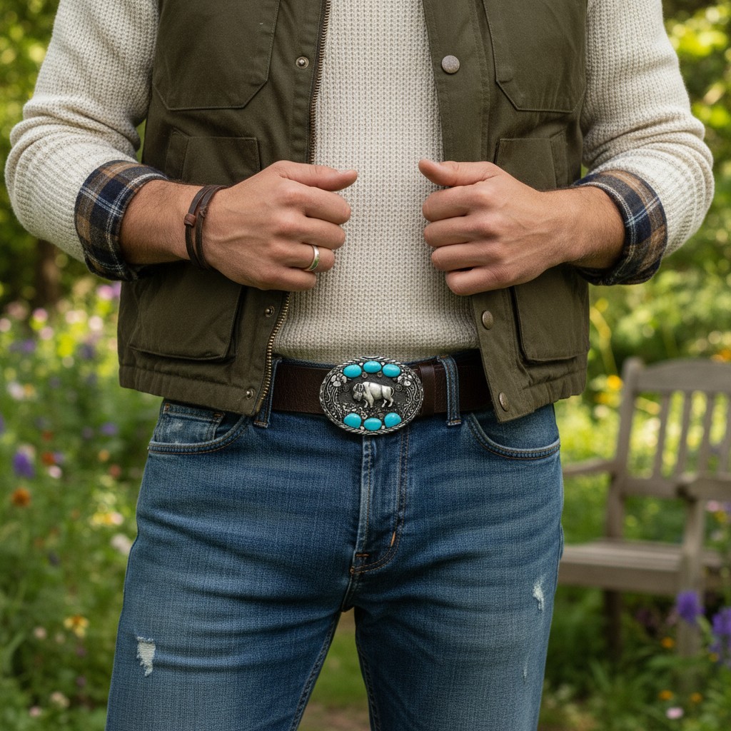 Men Buffalo Ox Silver Metal Belt Buckle Bull Turquoise Blue Oval Shape Classic