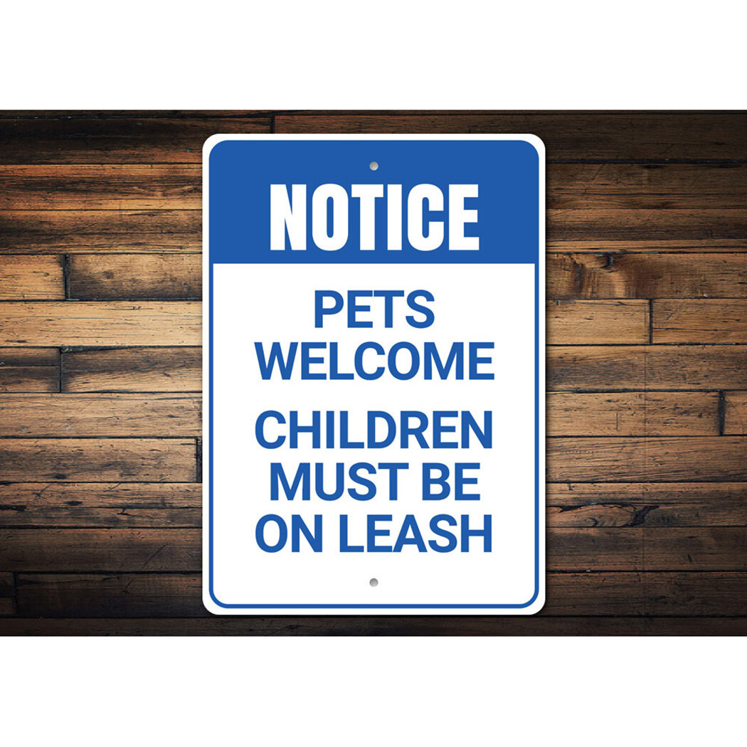 Notice: Pets Welcome, Children Must Be on Leash, Pet-Lover Metal Sign