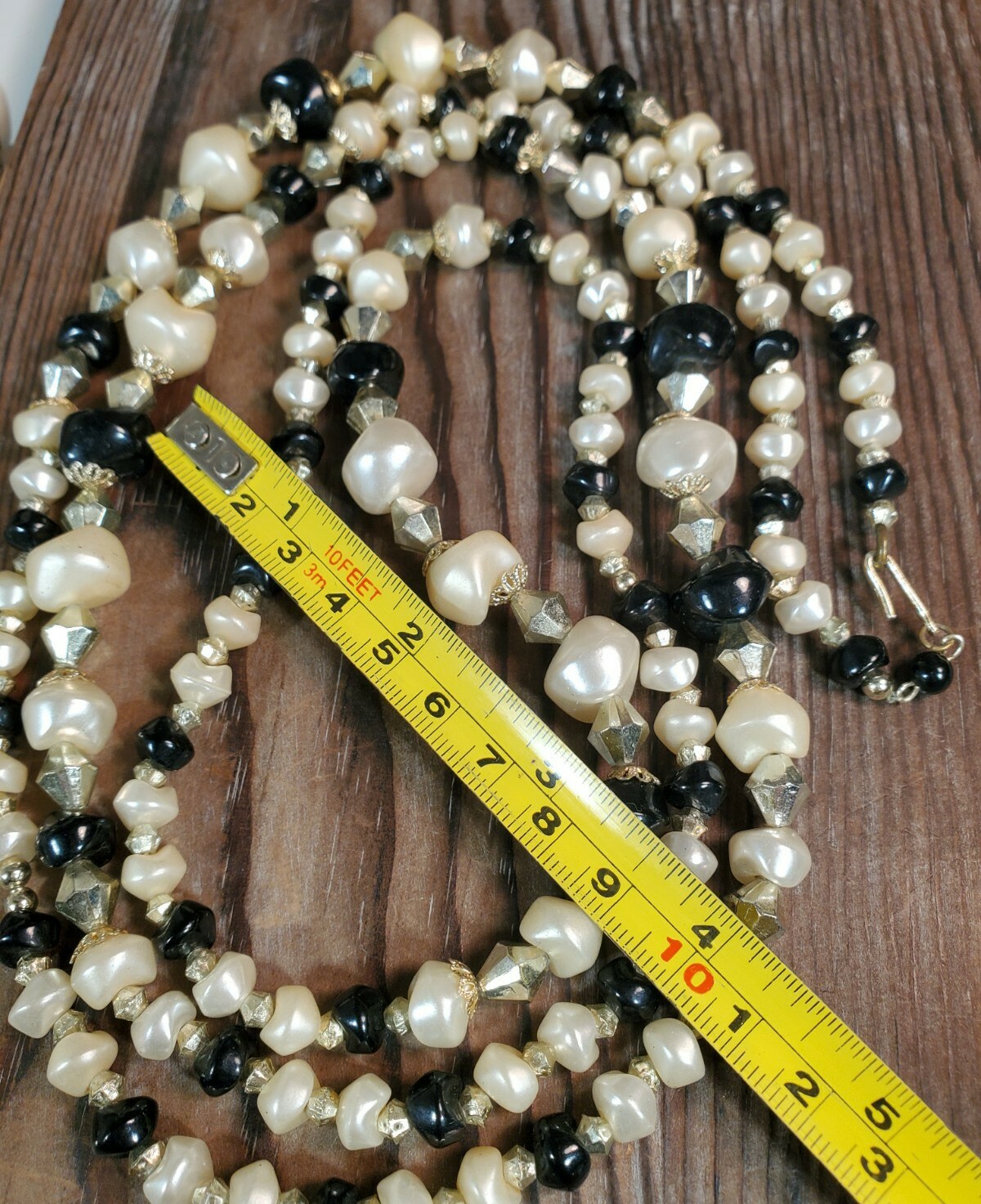как выглядит Vintage Beaded Necklace Japan Faux large Pearls Black Gold Accent 56" long фото