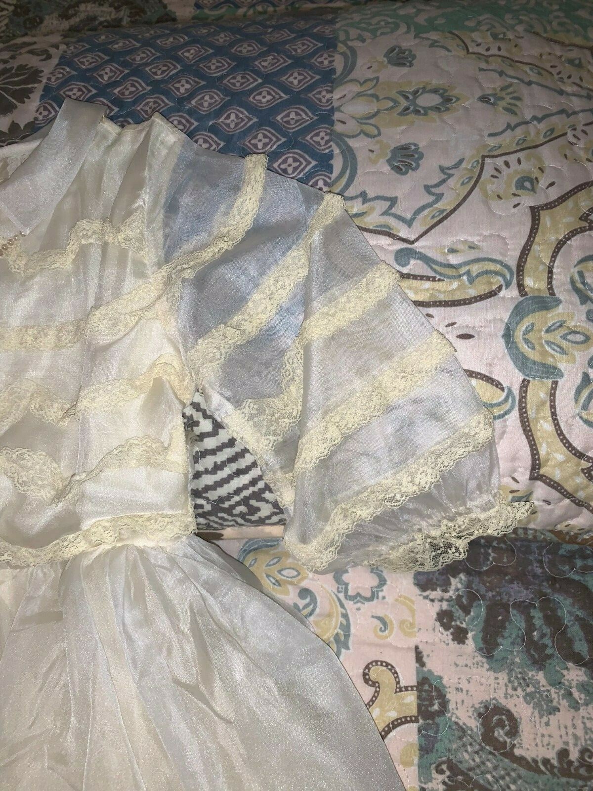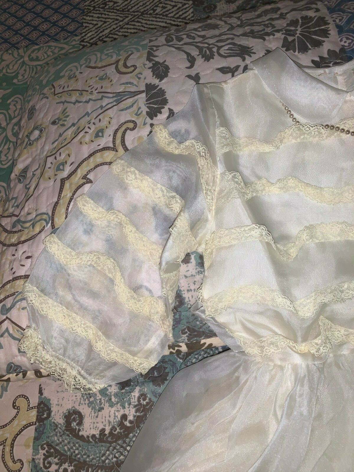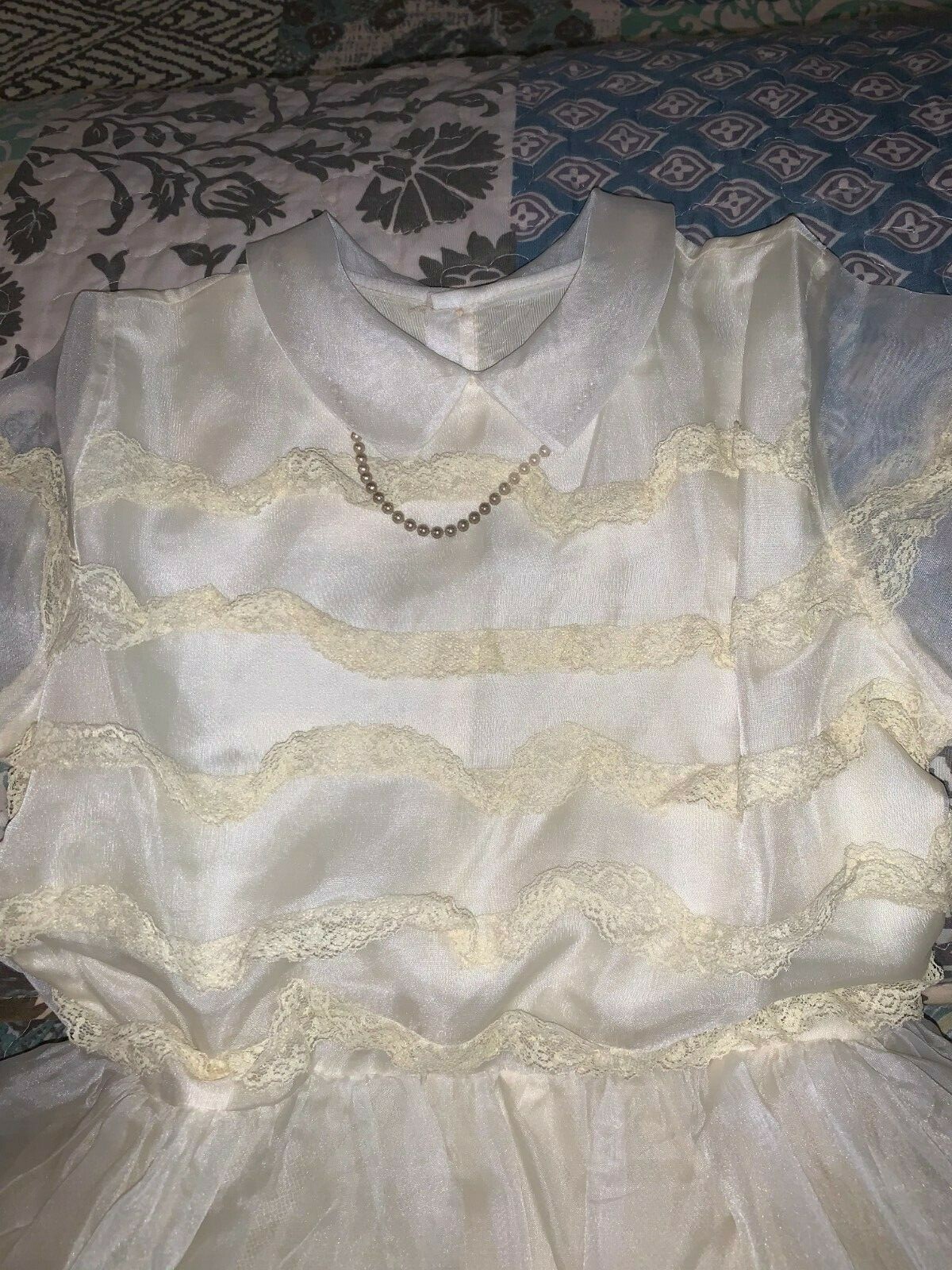 как выглядит True VTG Girls Off White Sheer Party Dress Pearls Lace Nylon Full Circle RARE фото
