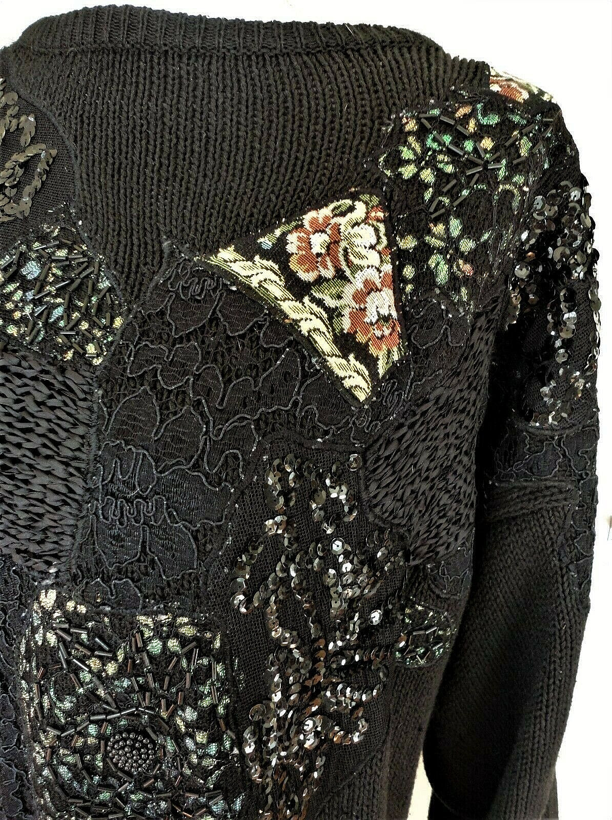 VINTAGE 80s BONNIE BOERER P-R-E-T SWEATER L Black Beads/Sequins/Fabric Patches