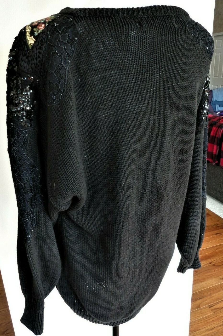 как выглядит VINTAGE 80s BONNIE BOERER P-R-E-T SWEATER L Black Beads/Sequins/Fabric Patches фото