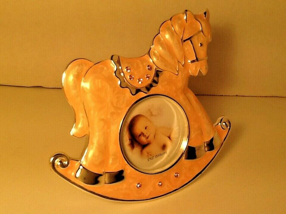 Rocking Horse Photo Frame Enamel Pink Rhinestones Baby 4.5 Tall