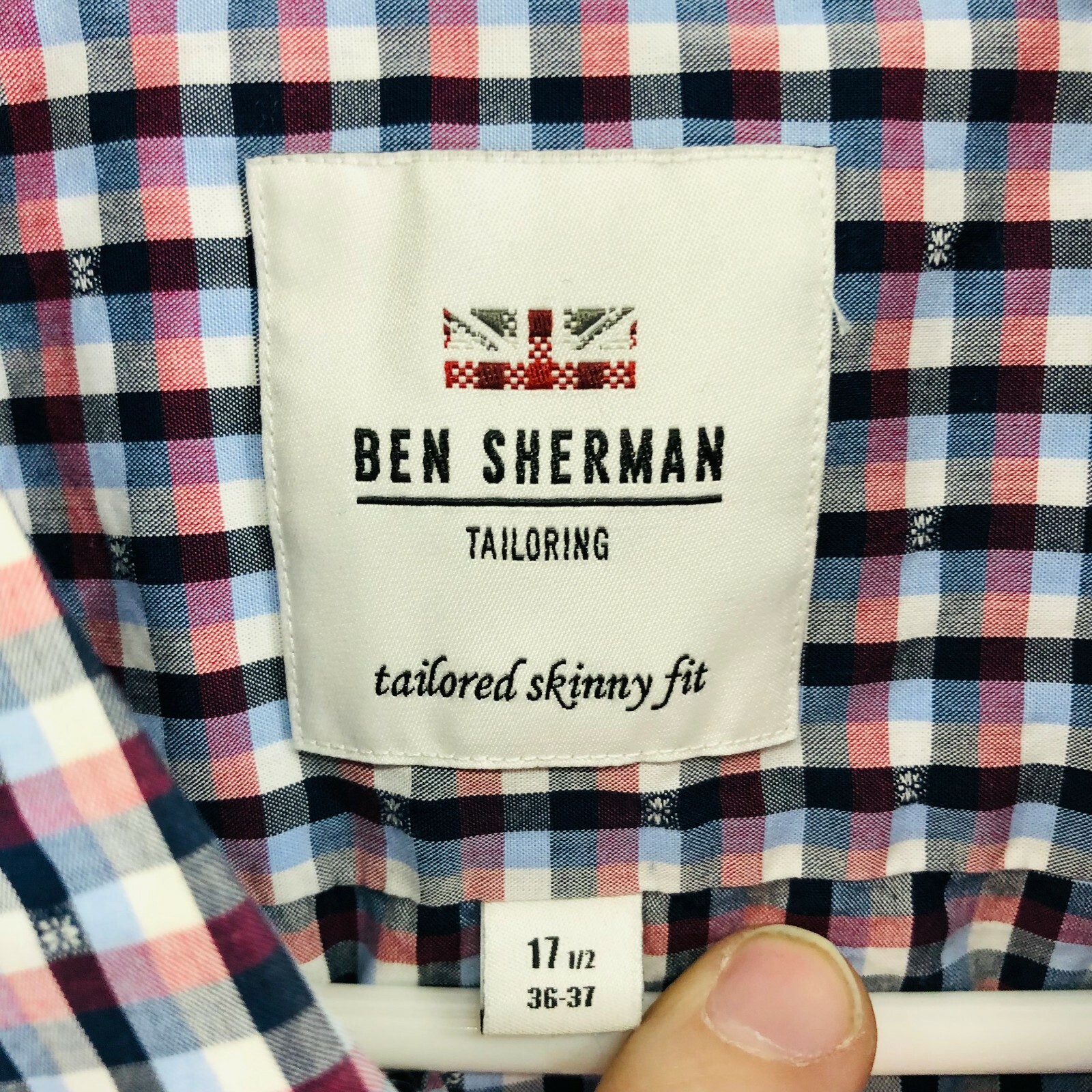 Ben Sherman Men 17.5 36-37 Tailored Skinny Fit Red Plaid Long Sleeve Button Down