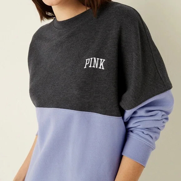 как выглядит SEALED VICTORIA SECRET PINK VARSITY CREW NECK BLACK/PURPLE MED 170/96A фото