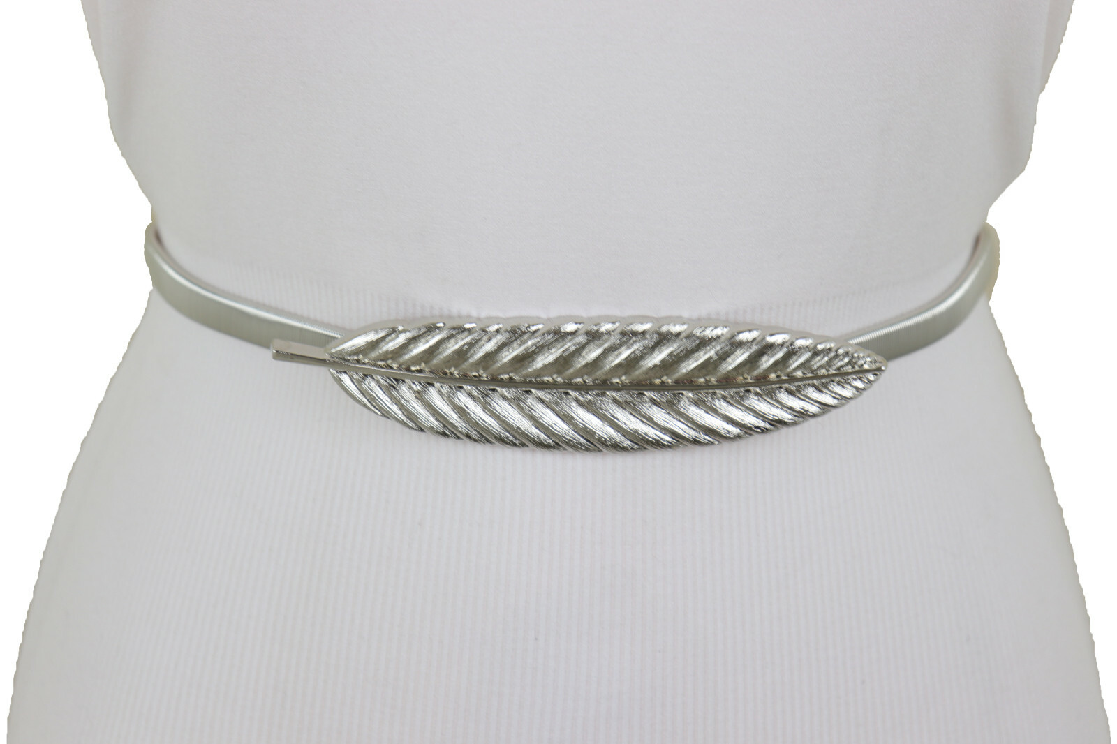 Women Shiny Silver Color Metal Leaf Stretch Skinny Waistband Belt Size Fit S M L