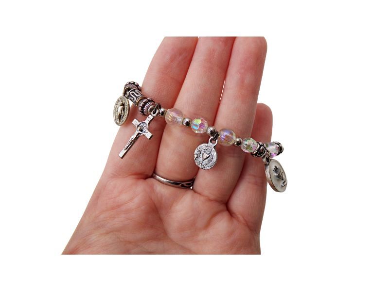 Silver Toned First Communion Medals Clear Beaded Rosary Stretch Bracelet 6 Inch
