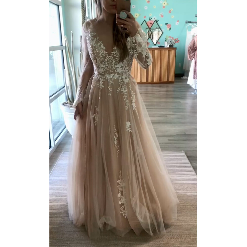 как выглядит Beach Champagne Wedding Dresses Long Sleeve V Neck Lace A Line Boho Bridal Gowns фото
