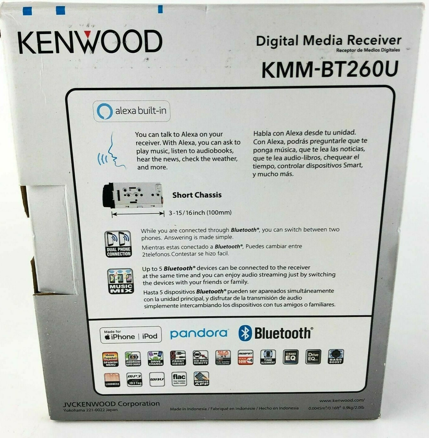 Особенности: Auxiliary Input, Bluetooth Ready, Detachable Face, Equalizer, Internet Radio Ready, Smartphone Charging, digital media receiver, AM FM Radio, Amazon Alexa, plays MP3, WAV, AAC, WMA, plus high-res FLAC, WAV, variable-color illumination, high-pass & low-pass, iPhone, Apple Music, iTunes Radio, Android, front USB (1.5A) and AUX inputs, built-in amplifier (22 watts RMS/50 peak x 4 chan), 2-channel preamp output2 (2.5-volt), Pandora, Spotify