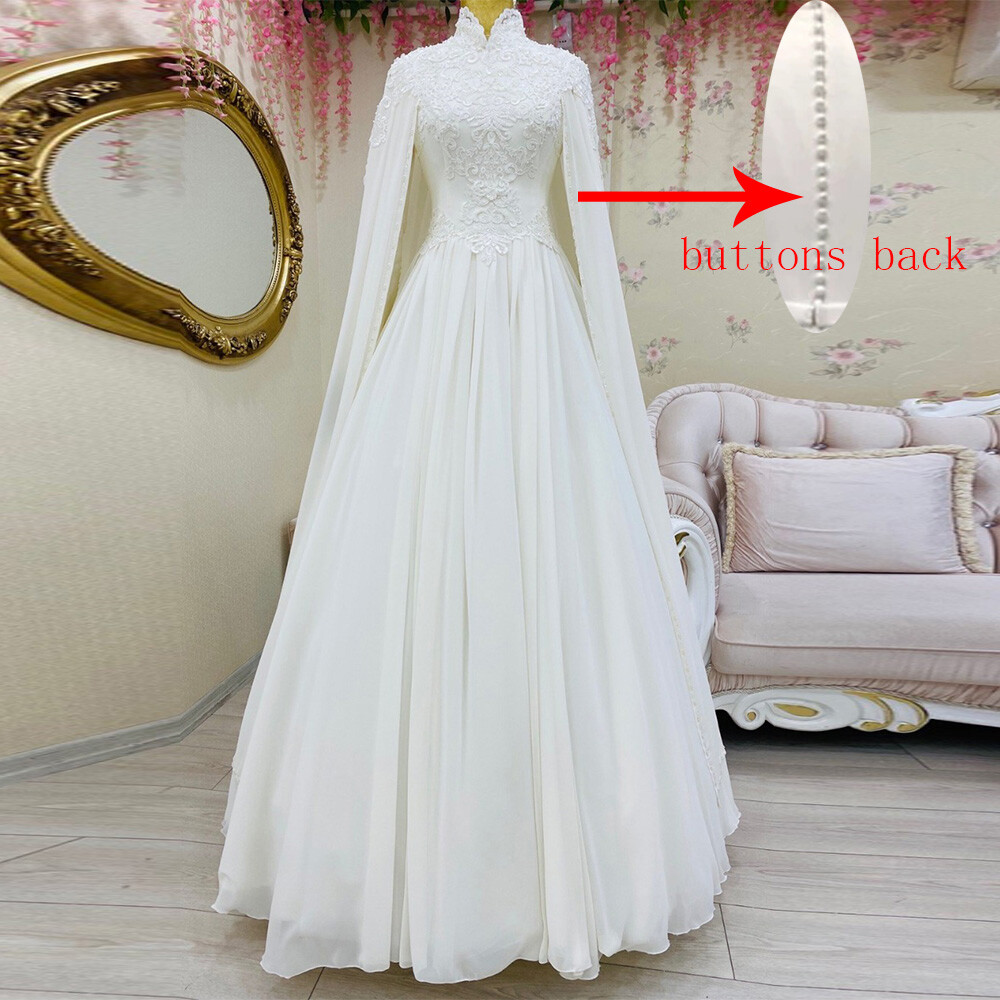Muslim Chiffon Wedding Dress with Cape High Neck Beads Lace Applique Bridal Gown