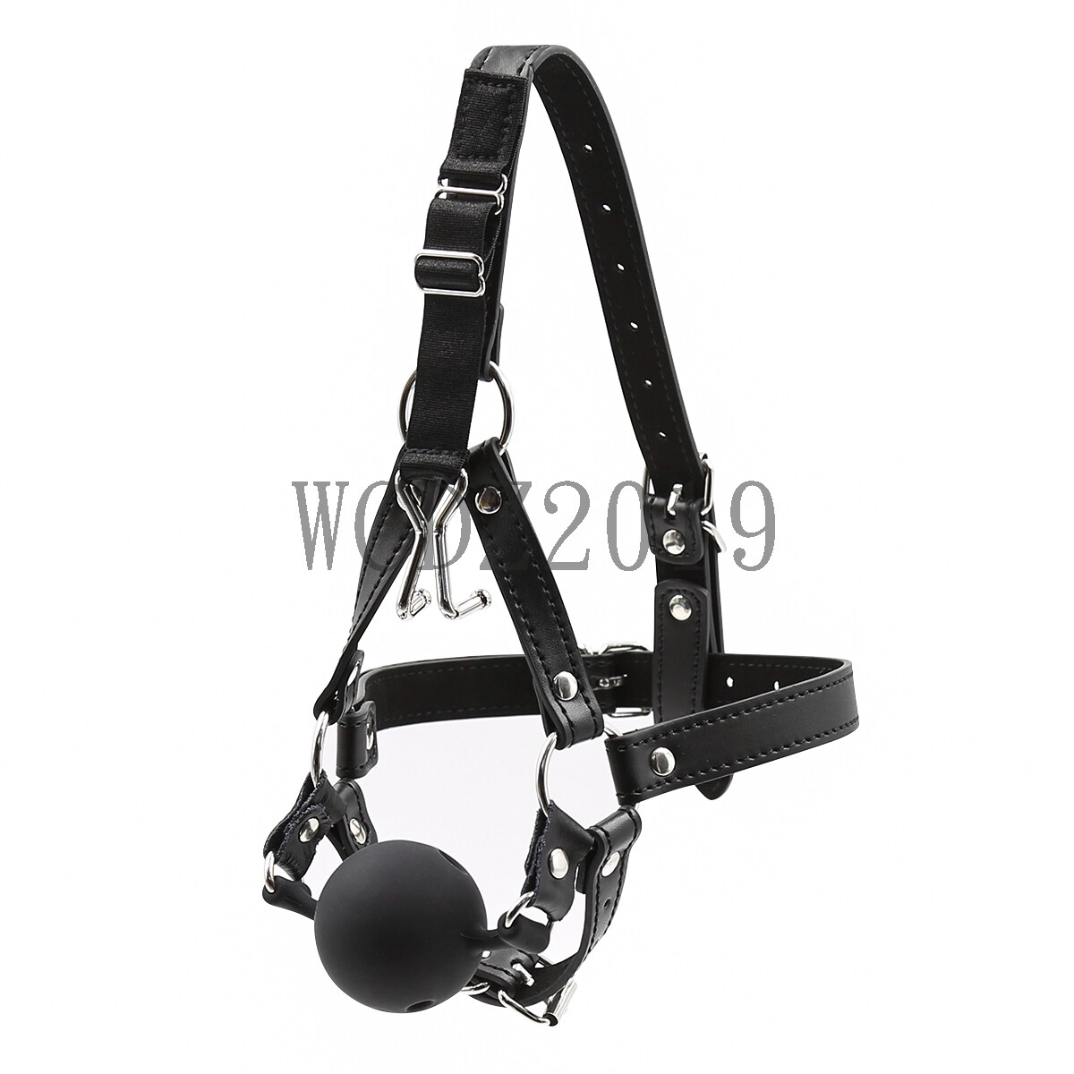 Bondage Head Harness Hood Headgear Mask Silicone Ball Gag with Slave Nose Hook