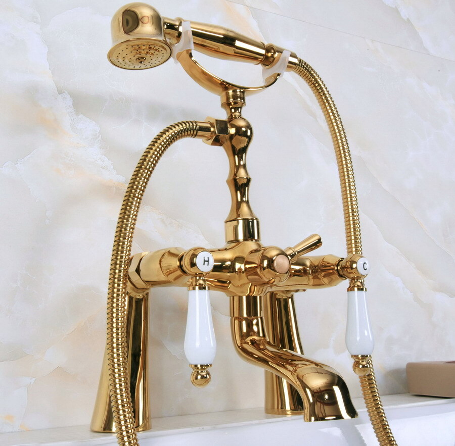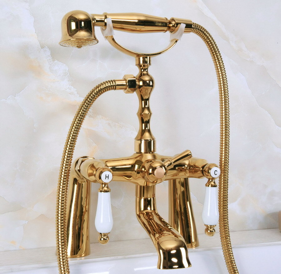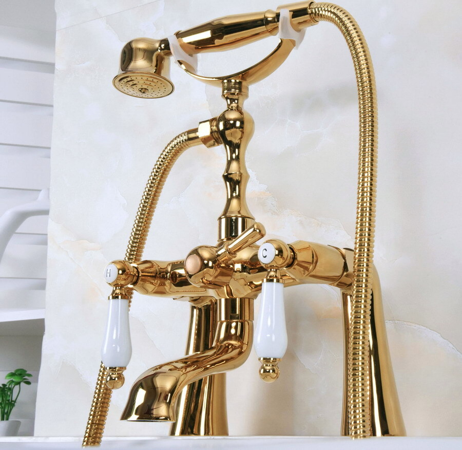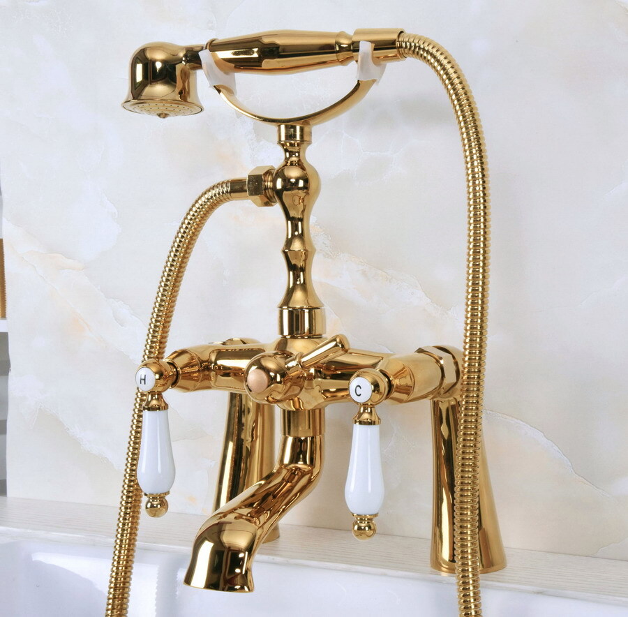 Gold Brass Bath Bathtub Clawfoot Tub Faucet W/ Hand Shower Deck Mounted ena141
