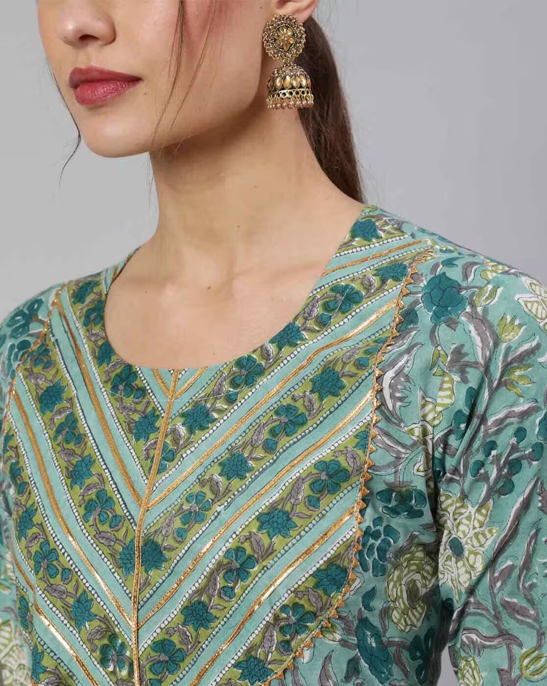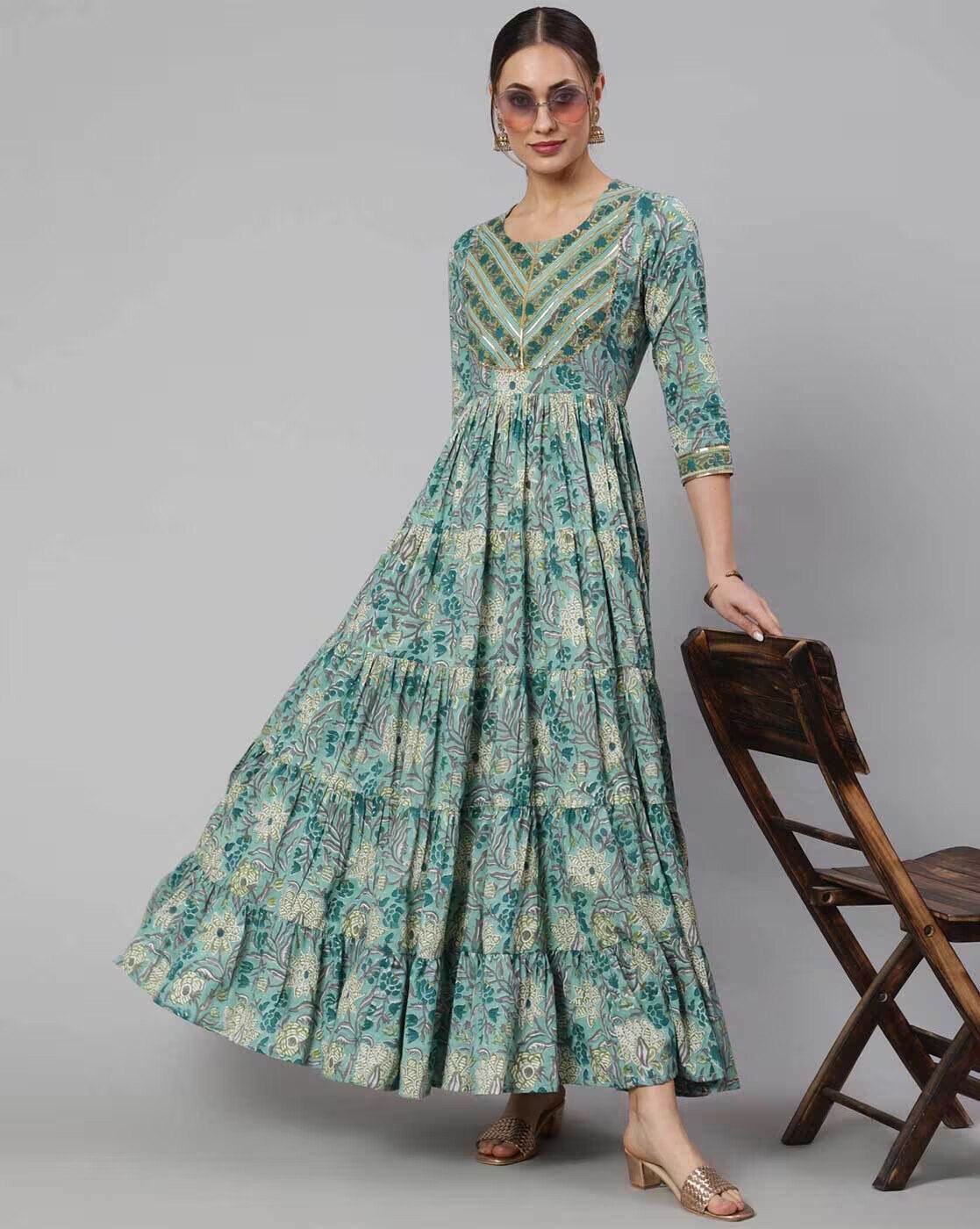 как выглядит Indian Women Green BEAUTIFUL Cotton Print Anarkali Flared Kurta Kurti Long Dress фото
