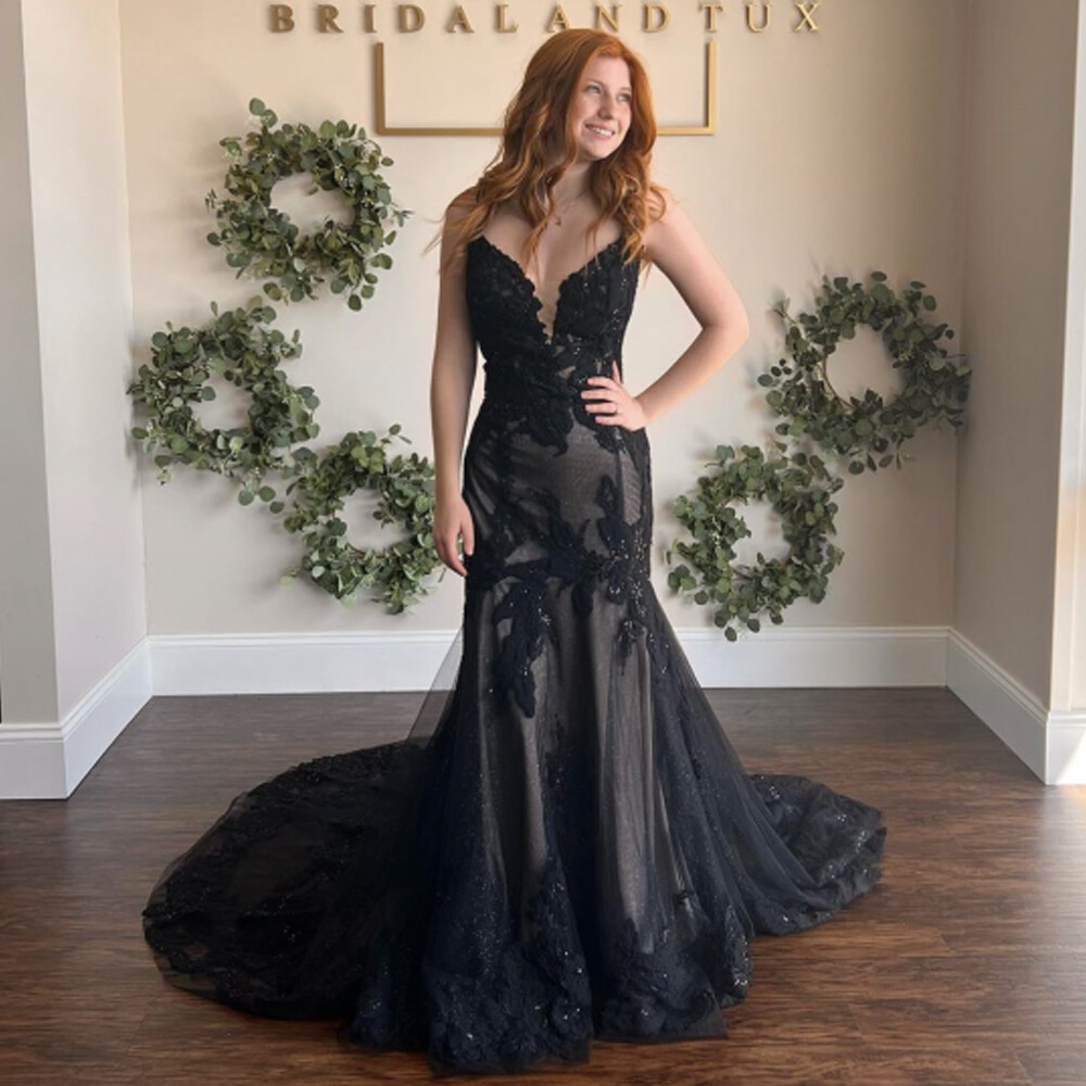 Gothic Black Mermaid Wedding Dresses with Sweep Train Lace Applique Bridal Gowns